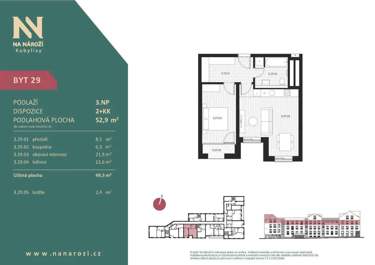 Tento byt 2+kk vznikne v projektu Na Nároží v pražských Kobylisích ve 3.NP moderního bytového domu v pěší dostupnosti metra. Podlahová plocha bytu je 52,9 m², celková plocha bytu včetně lodžie (2,4 m²) činí 51,7 m². K bytu náleží sklep, který je započten v ceně.