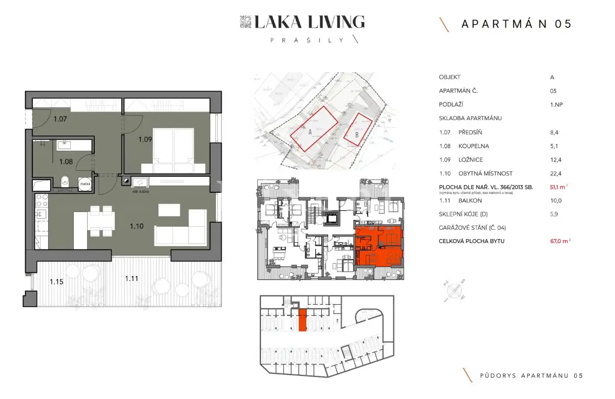 Nabízíme k prodeji luxusní horský apartmán o dispozici 2+kk o obytné ploše 48,3 m2 a podlahové ploše 51,1 m2 s balkonem o velikosti 10 m2. Byt se nachází v 1. nadzemním podlaží apartmánového domu „A“ v nově vznikajícím developerském projektu LAKA LIVING na Šumavě. Apartmán je orientován na SV a JV stranu. Byt se skládá z obytné místnosti (22,4 m2), ložnice (12,4 m2), koupelny se sprchou a toaletou (5,1 m2) a předsíně (8,4 m2).