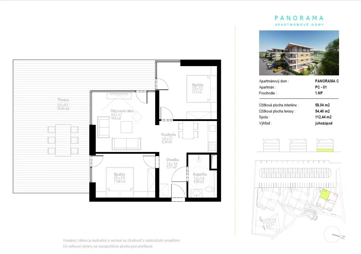Nabízíme k prodeji byt 3+kk v nové rezidenci Marina Liptov nacházející se v obklopení majestátných vrchů, malebných národních parků a nejdelší slovenské přehrady Liptovská Mara. Byt se nachází v 1.NP a disponuje obytnou plochou 58 m2 a celkovou užitnou plochou 112 m2. Rozložení bytu nabízí obývací pokoj s kuchyňským koutem, dvě ložnice a koupelnu, k bytu taktéž náleží prostorná terasa 54,4 m2 přístupná ze všech tří pokojů. Dům má bezbariérový přístup a výtah, ke každému bytu náleží parkovací stání a sklepní kóje, které jsou již zahrnuty v ceně.