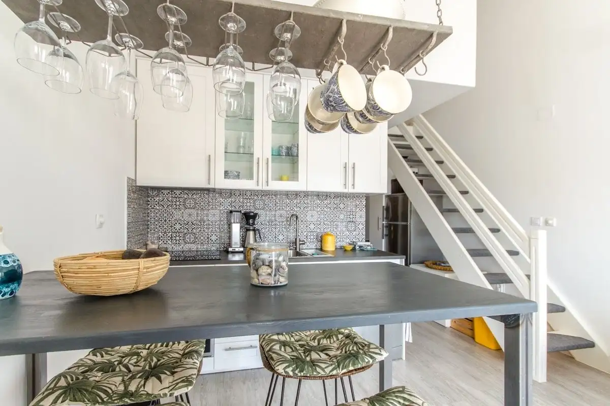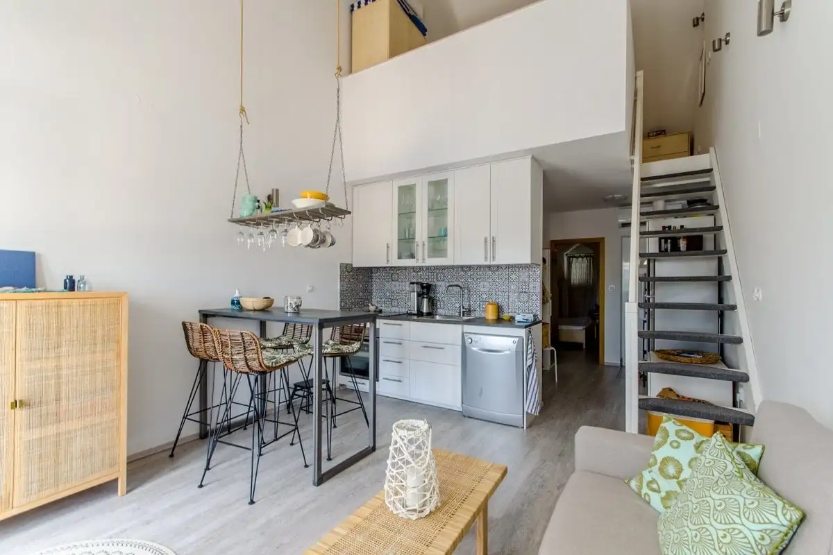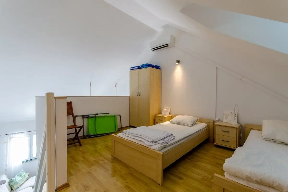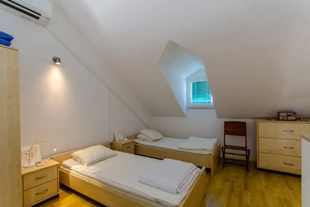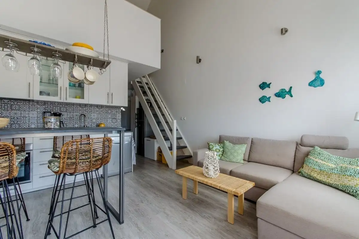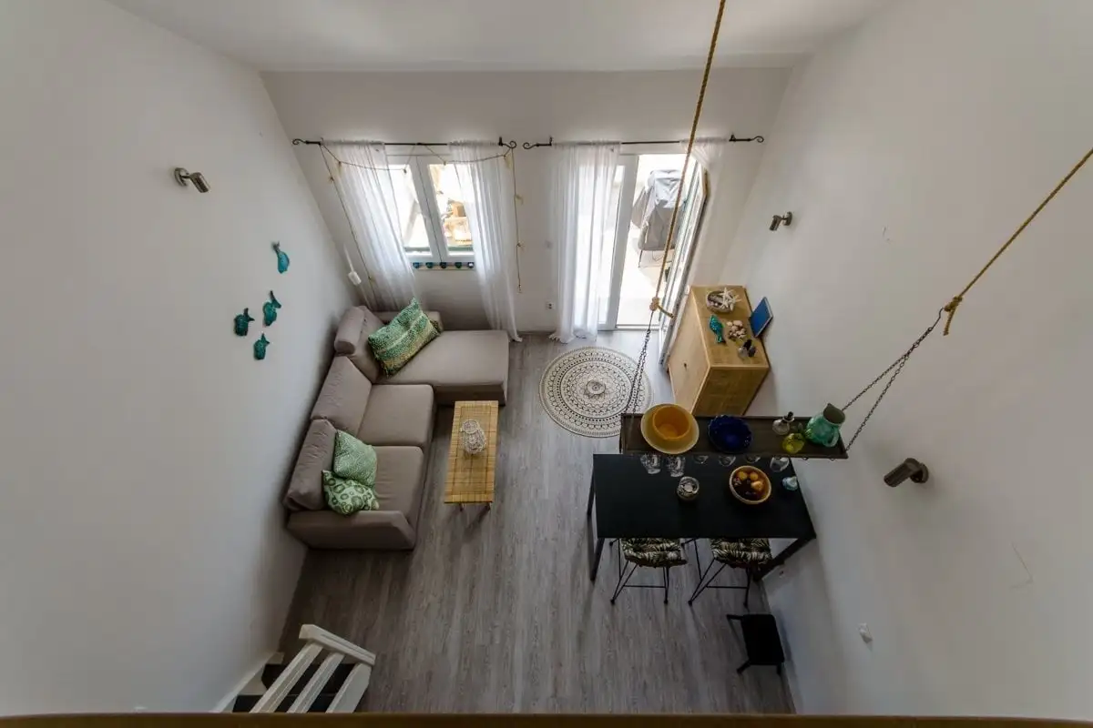 Tento útulný dvoupodlažní apartmán o celkové ploše 64 m² se nachází jen 10 metrů od moře a nabízí ničím nerušený výhled na záliv a historické centrum města. Spodní podlaží tvoří obývací pokoj s kuchyňským a jídelním koutem, odkud je vstup na prostorný balkon o velikosti 10,7 m² s otevřeným výhledem na moře. Dále se zde nachází jedna ložnice a koupelna. V horním patře je umístěna druhá ložnice v otevřené galerii.