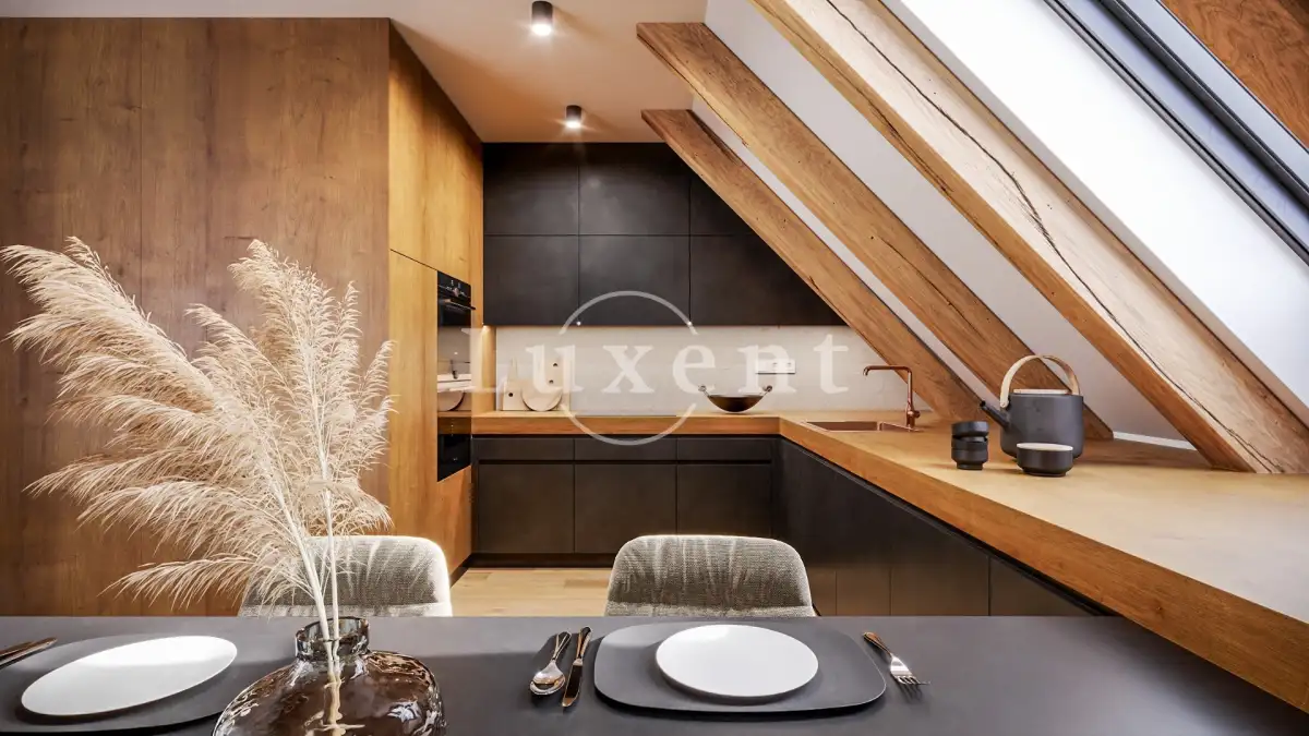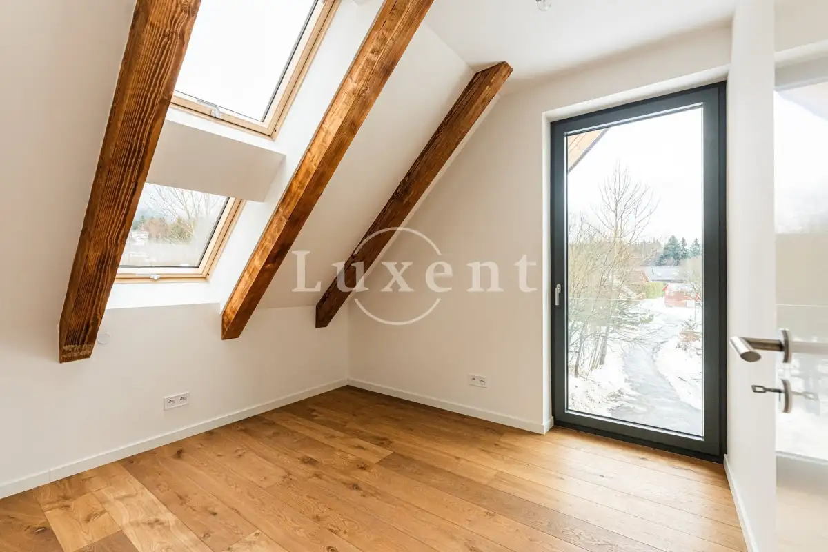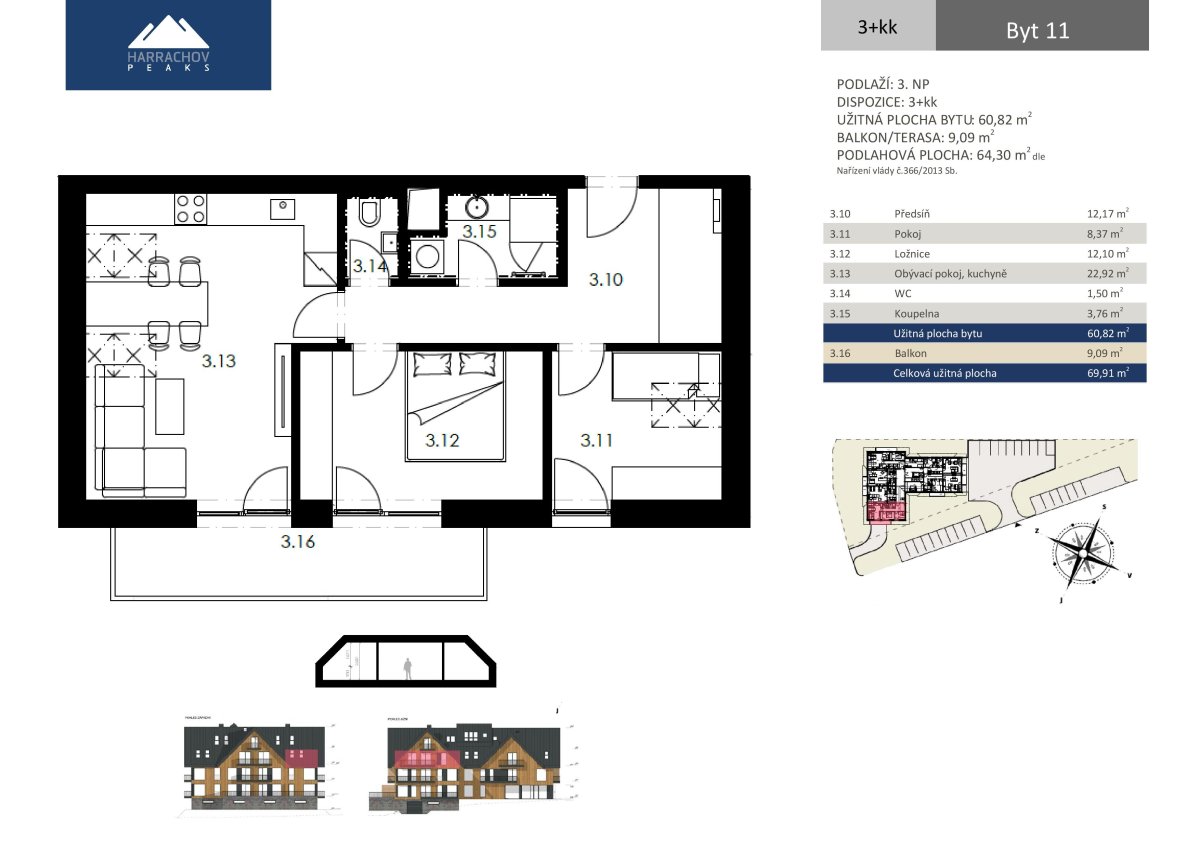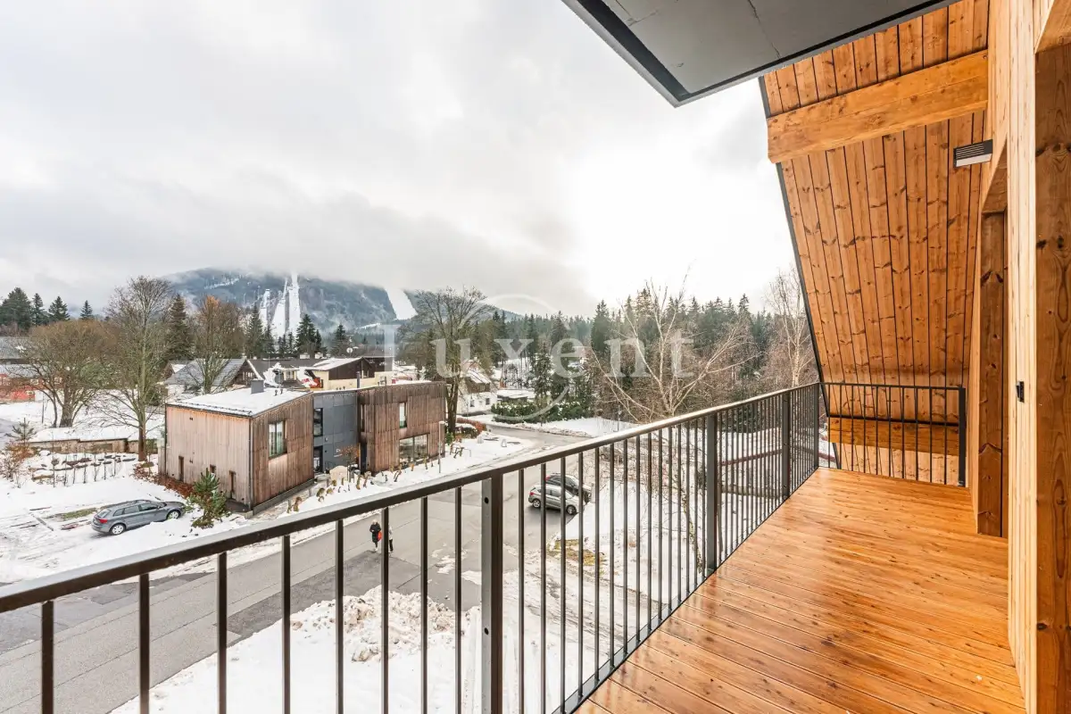 Nabízíme apartmán o dispozici 3+kk ve 3. NP luxusního projektu HARRACHOV PEAKS. Apartmán má obytnou plochu 60,82 m2 (ve světlé podchozí výšce nad 1,2 m je to 57,8 m2) a celkovou užitnou plochu 69,91 m2 s balkonem (9,09 m2). Byt má sklep a garážové stání (není zahrnuto v ceně). Projekt je dokončen a zkolaudován a k dispozici je už vzorový byt. V suterénu je majitelům k dispozici wellness se saunou a vířivkou a vybavené fitness.