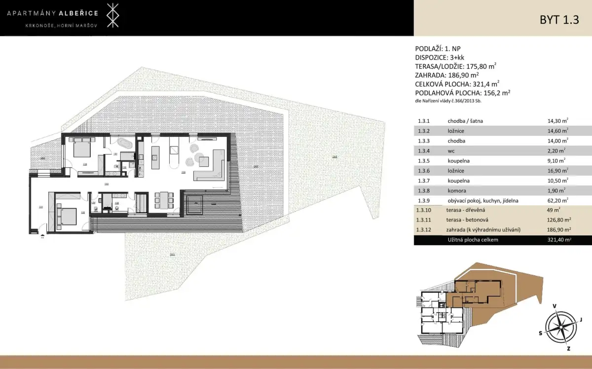 V nově vznikajícím projektu Apartmány Albeřice nabízíme k prodeji apartmán o dispozici 3+kk a ploše 145,6 m2 s terasou 175,8 m2 a zahradou k výhradnímu užívání 186,9 m2. Apartmán se nachází v 1. NP projektu a je orientován na jih, východ a západ. Vybaven je ve vysokém standardu, který je možné rozšířit do nadstandardního provedení, zejména co do rozsahu obložení stěn a stropů jednotlivých pokojů rustikálním stařeným dřevem. K apartmánu patří úložné prostory v zabezpečeném samostatném skladu. Další jeho součástí je kryté parkovací stání. K využití bude také společná lyžárna v 1. NP s uzamykatelnými boxy.