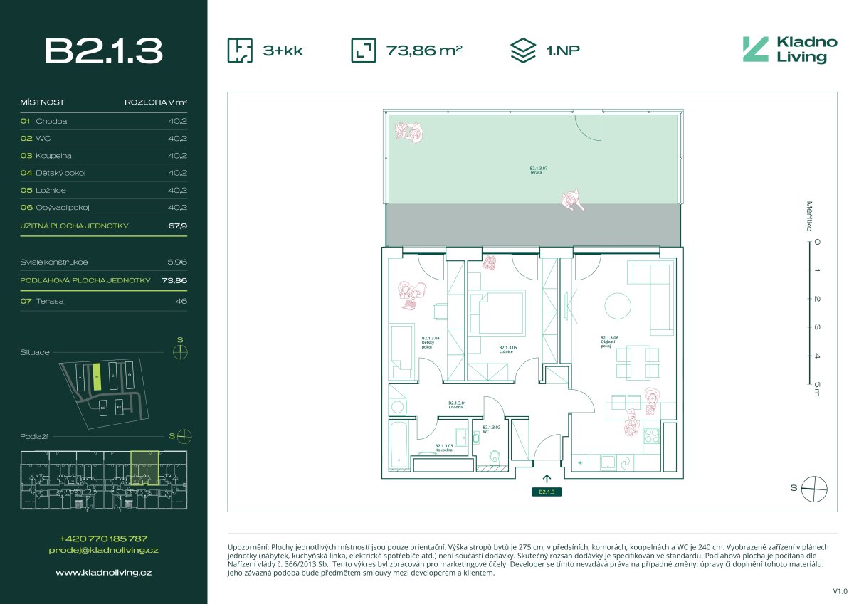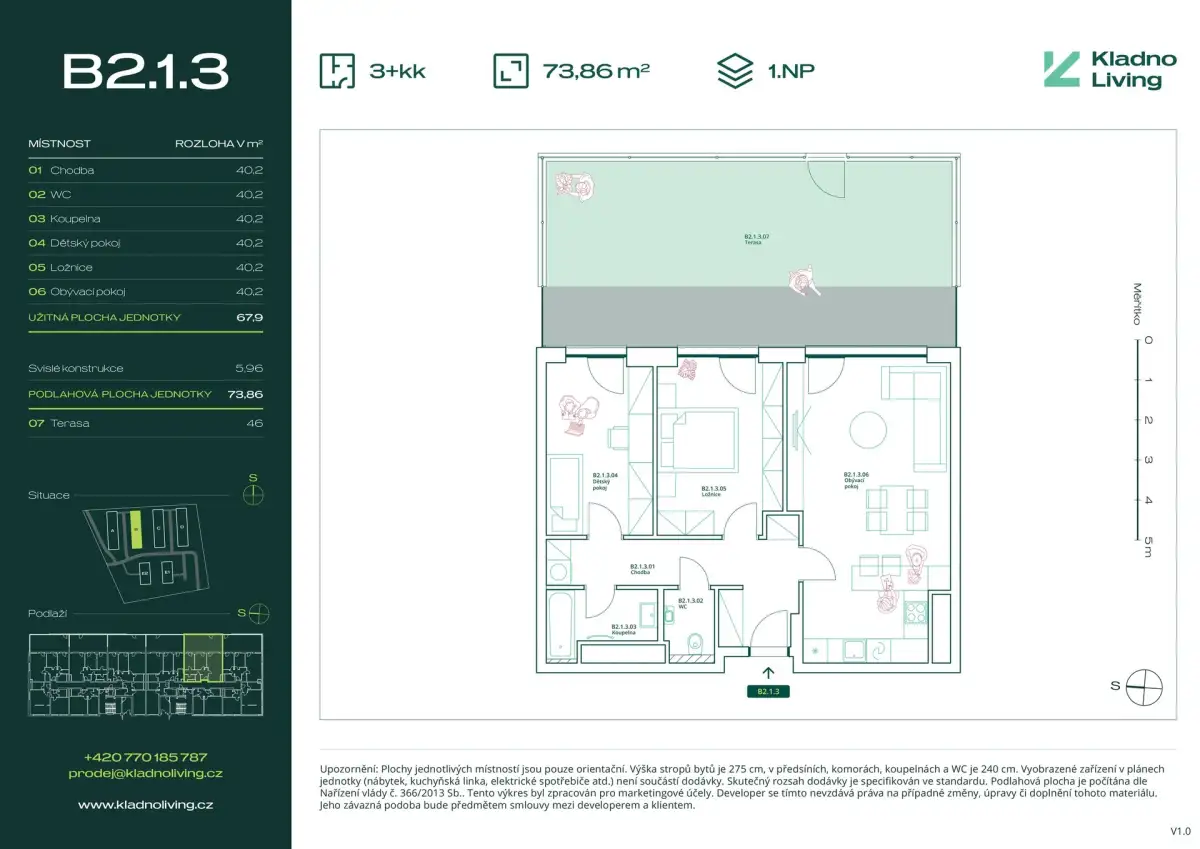 Nabízíme ke koupi moderní byt 3+kk o podlahové ploše 73,9 m² s terasou 46 m² v rezidenčním projektu Kladno Living, který vzniká v jedné z nejatraktivnějších lokalit města Kladno – Kročehlavy. Tento nový developerský projekt představuje jedinečnou příležitost pro ty, kteří hledají nové byty v Kladně nebo investici do nemovitosti s vysokým potenciálem zhodnocení.
