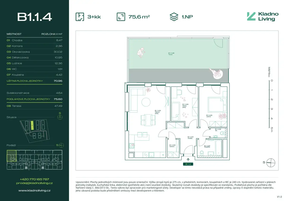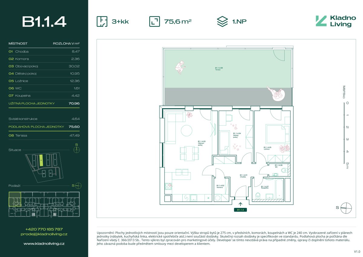 Nabízíme ke koupi moderní byt 3+kk o podlahové ploše 75,6 m² s terasou 47,5 m² v rezidenčním projektu Kladno Living, který vzniká v jedné z nejatraktivnějších lokalit města Kladno – Kročehlavy. Tento nový developerský projekt představuje jedinečnou příležitost pro ty, kteří hledají nové byty v Kladně nebo investici do nemovitosti s vysokým potenciálem zhodnocení.