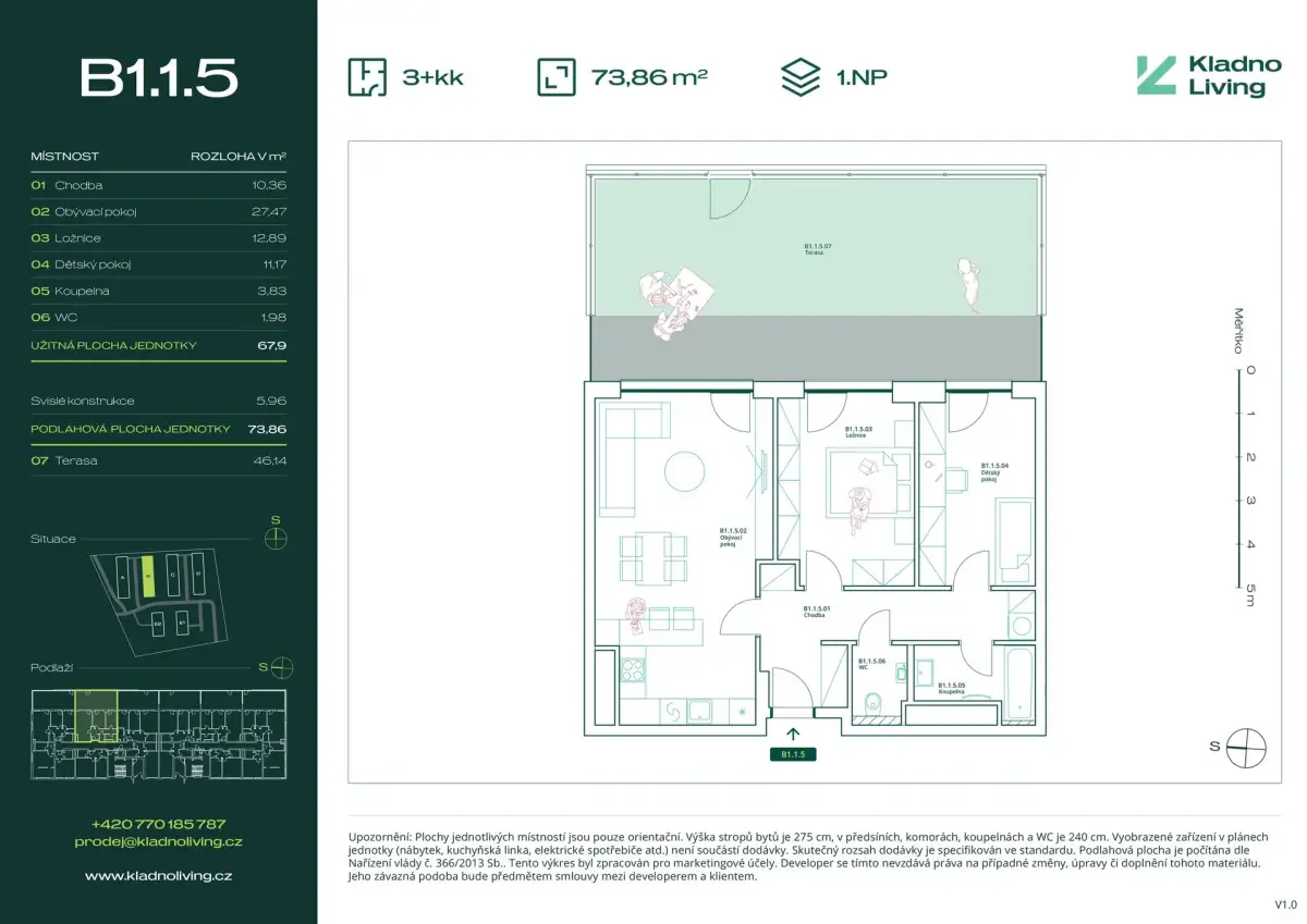 Nabízíme ke koupi moderní byt 3+kk o podlahové ploše 73,9 m² s terasou 46,2 m² v rezidenčním projektu Kladno Living, který vzniká v jedné z nejatraktivnějších lokalit města Kladno – Kročehlavy. Tento nový developerský projekt představuje jedinečnou příležitost pro ty, kteří hledají nové byty v Kladně nebo investici do nemovitosti s vysokým potenciálem zhodnocení.