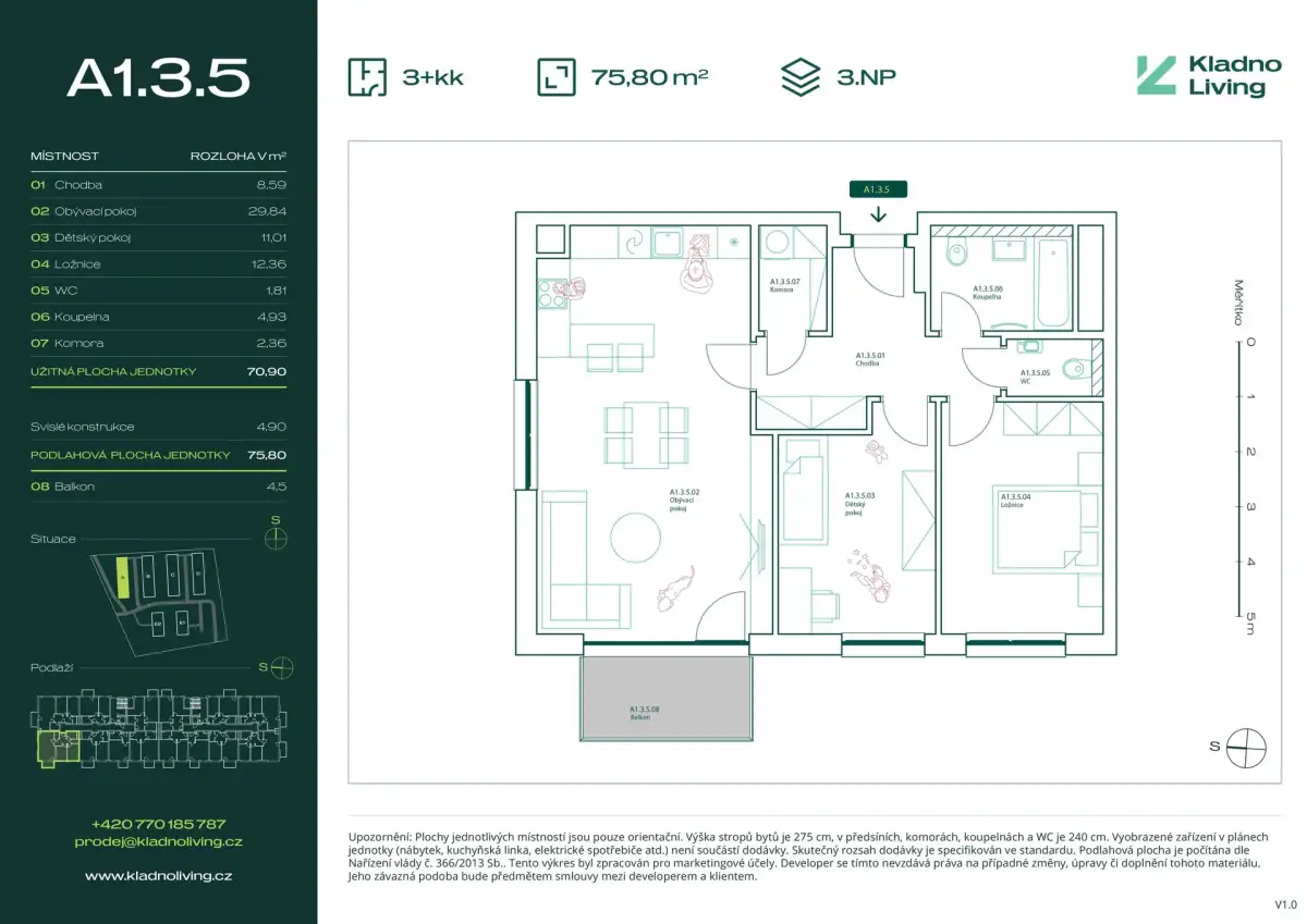 Nabízíme ke koupi moderní byt 3+kk o podlahové ploše 75,8 m² s balkonem 4,5 m² v rezidenčním projektu Kladno Living, který vzniká v jedné z nejatraktivnějších lokalit města Kladno – Kročehlavy. Tento nový developerský projekt představuje jedinečnou příležitost pro ty, kteří hledají nové byty v Kladně nebo investici do nemovitosti s vysokým potenciálem zhodnocení.