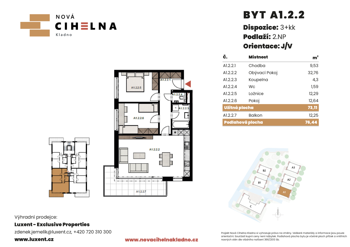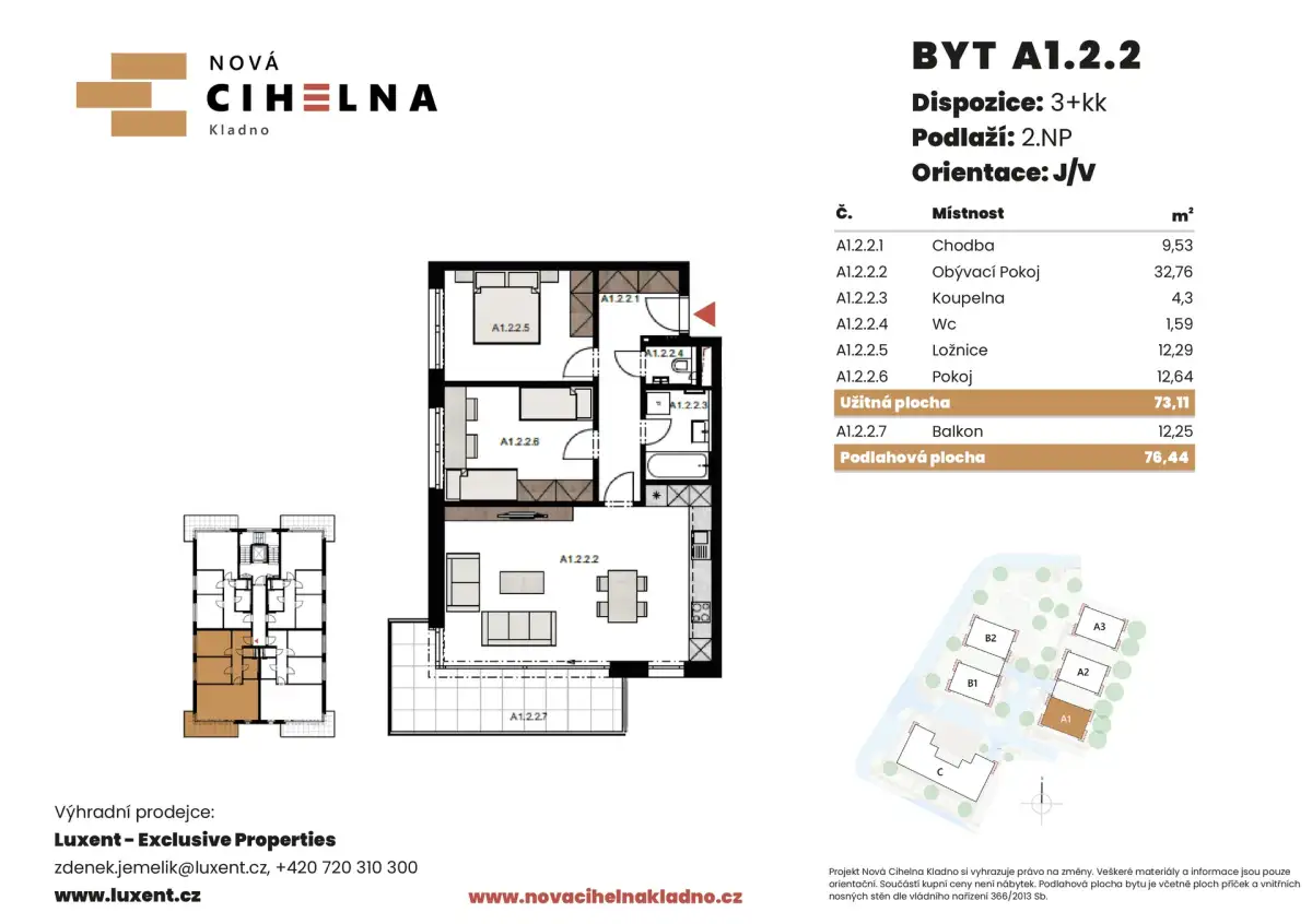 Nabízíme k prodeji byt 3+kk o podlahové ploše 76,44 m² s balkonem 12,25 m² v mimořádně úsporném developerském projektu Nová Cihelna Kladno vznikajícím v městské čtvrti Kladno – Rozdělov.