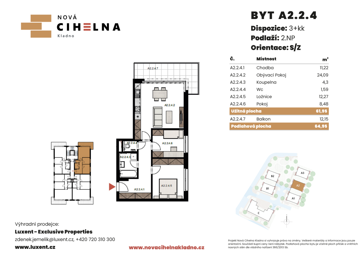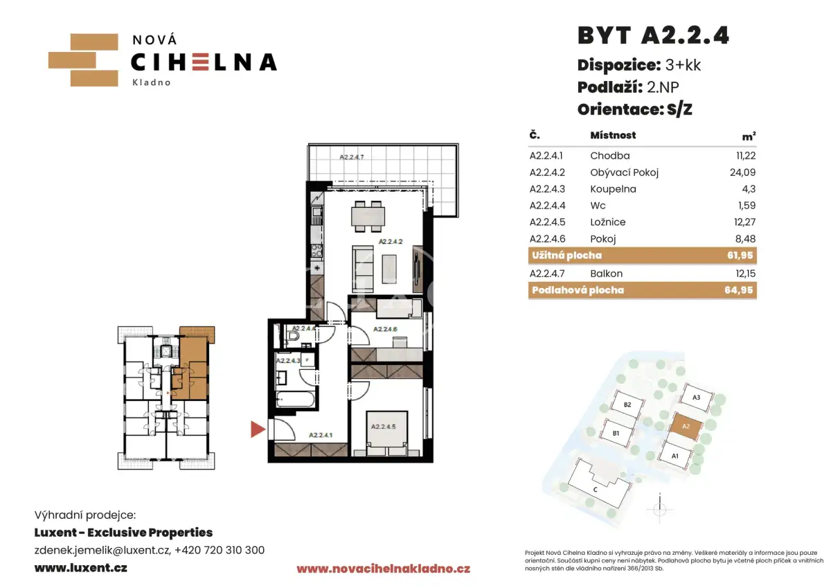 Nabízíme k prodeji byt 3+kk o podlahové ploše 64,95 m² s balkonem 12,15 m² v mimořádně úsporném developerském projektu Nová Cihelna Kladno vznikajícím v městské čtvrti Kladno – Rozdělov.