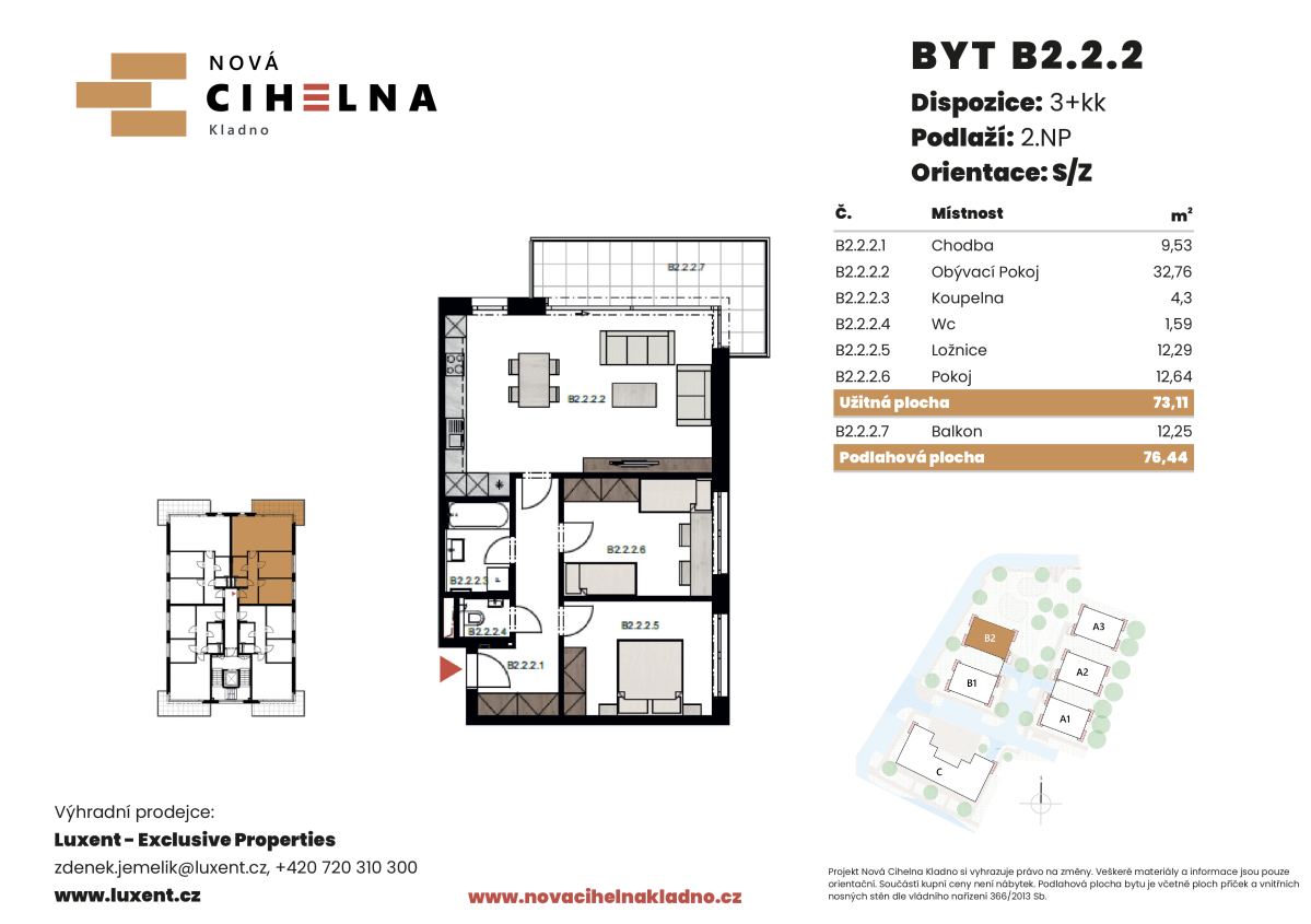 Nabízíme k prodeji byt 3+kk o podlahové ploše 76,44 m² s balkonem 12,25 m² v mimořádně úsporném developerském projektu Nová Cihelna Kladno vznikajícím v městské čtvrti Kladno – Rozdělov.