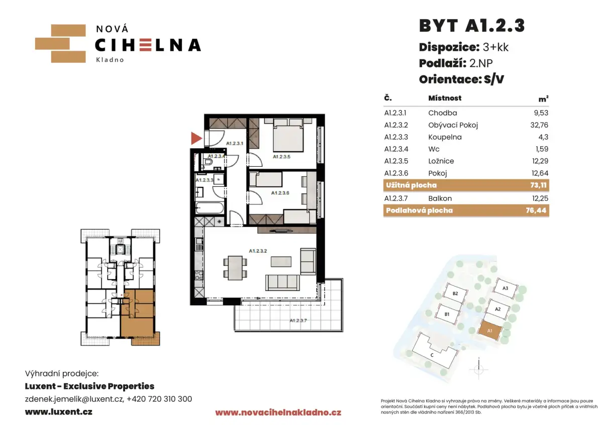 Nabízíme k prodeji byt 3+kk o podlahové ploše 76,44 m² s balkonem 12,25 m² v mimořádně úsporném developerském projektu Nová Cihelna Kladno vznikajícím v městské čtvrti Kladno – Rozdělov.
