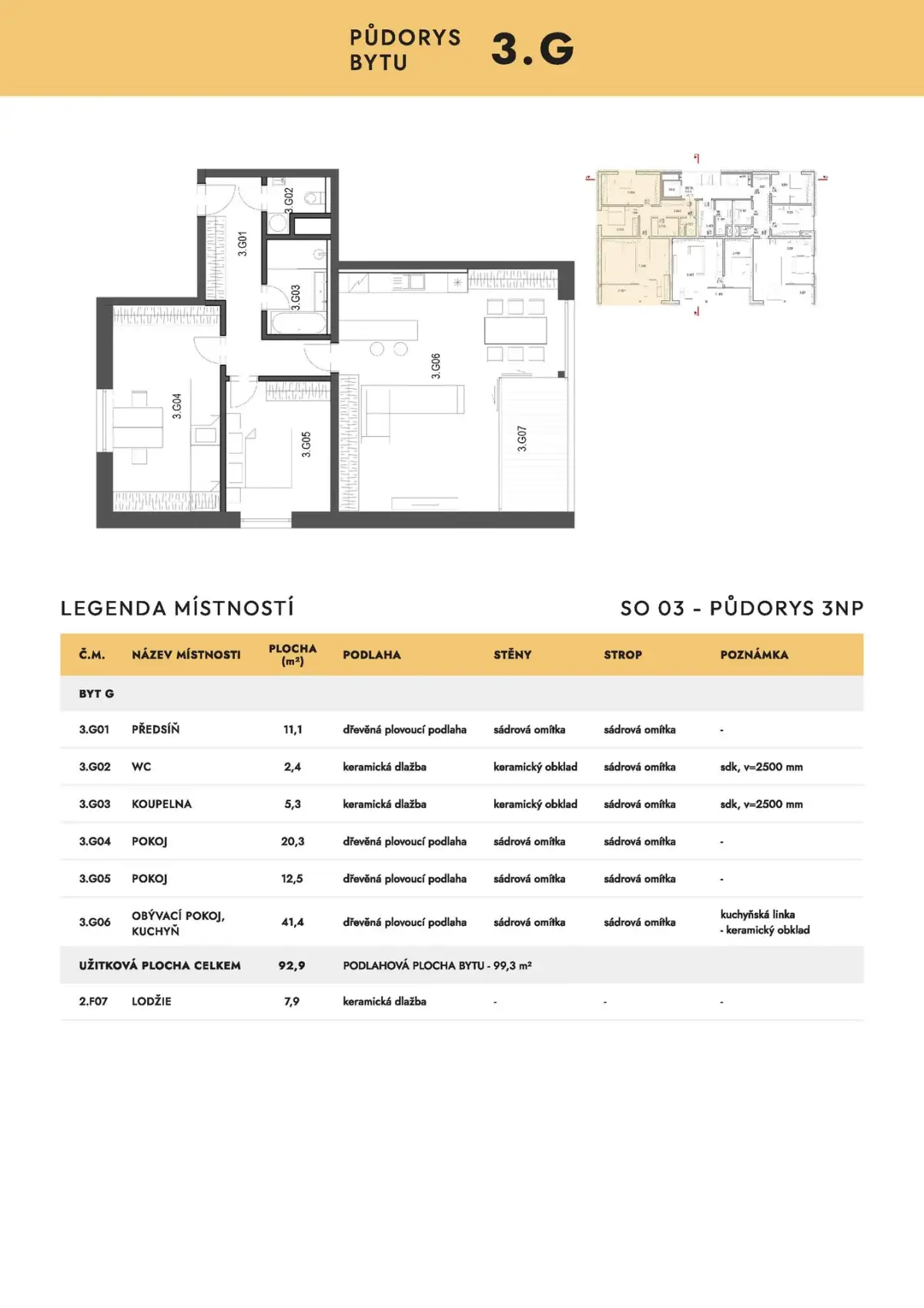 Byt o dispozici 3+kk a podlahové ploše 99,7 m2 se nachází ve třetím nadzemním podlaží budovy A a zahrnuje vstupní chodbu se vstupem na samostatnou toaletu a do koupelny se sprchovým koutem a vanou. Dále se zde nachází dvě ložnice a prostorný obývací pokoj s kuchyňským koutem a vstupem na lodžii (7,9 m2).
