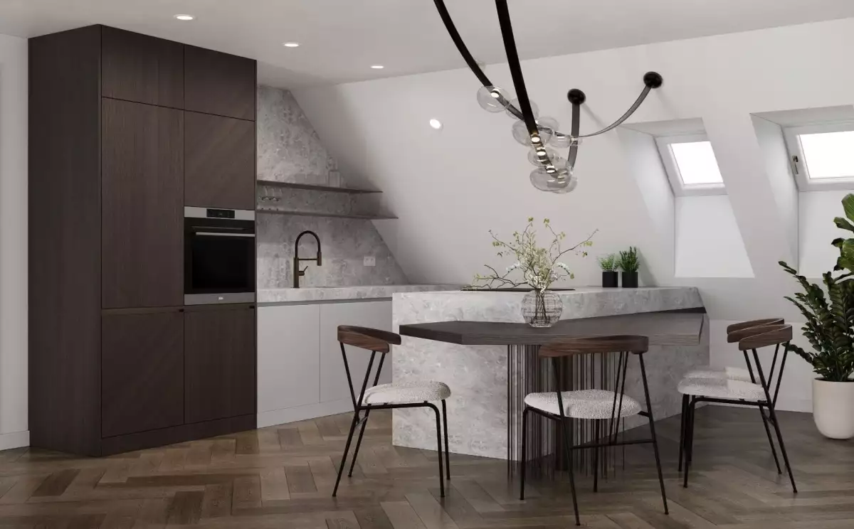 Bytová jednotka o dispozici 3+kk disponuje vlastní terasou a sklepní kóji. Interiér byl navržen předními architekty ze studia SMLXL s mimořádným důrazem na vysokou kvalitu materiálů, technickou preciznost a nadčasovou estetiku. Prostory vynikají promyšleným dispozičním řešením a prémiovými moderními standardy.