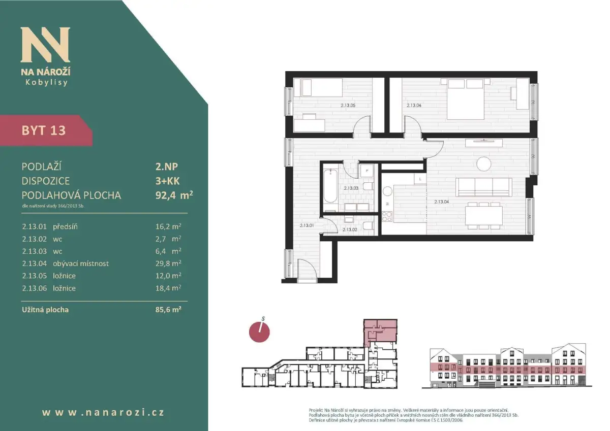 Tento byt 3+kk vznikne v projektu Na Nároží v pražských Kobylisích ve 2.NP moderního bytového domu v pěší dostupnosti metra. Podlahová plocha bytu je 92,4 m², celková plocha bytu činí 85,6 m². K bytu náleží sklep, který je započten v ceně.