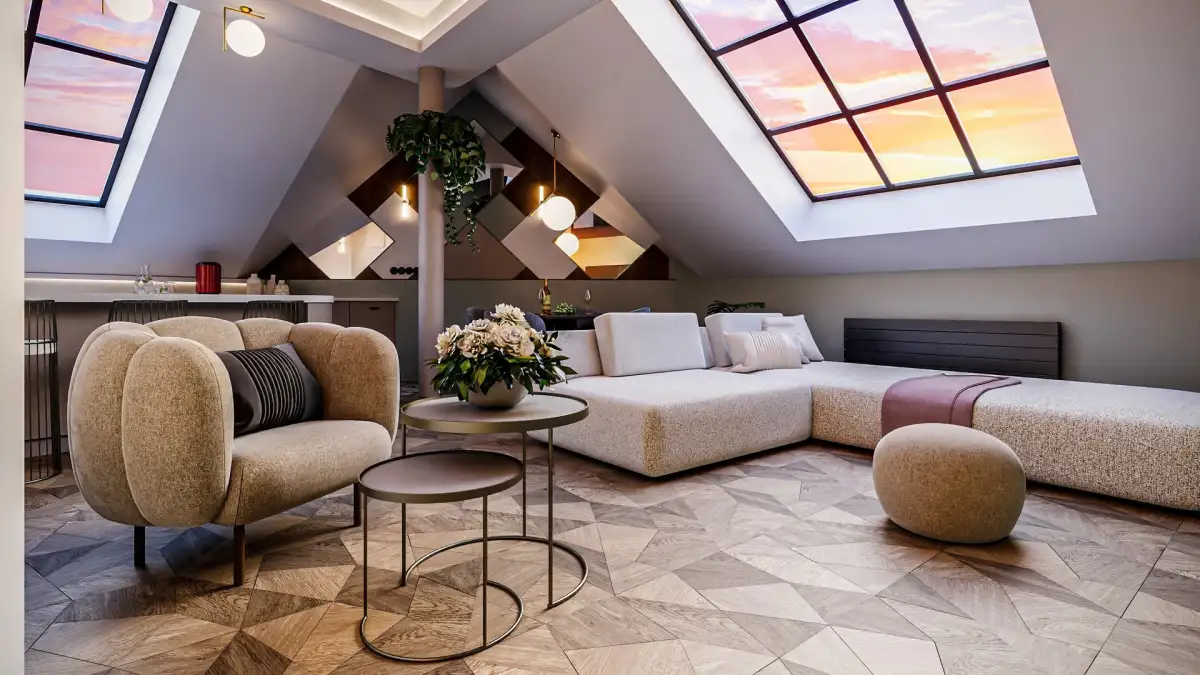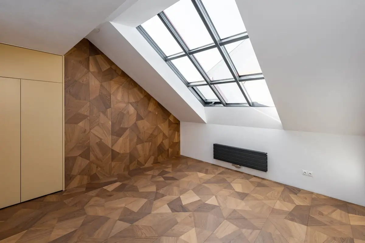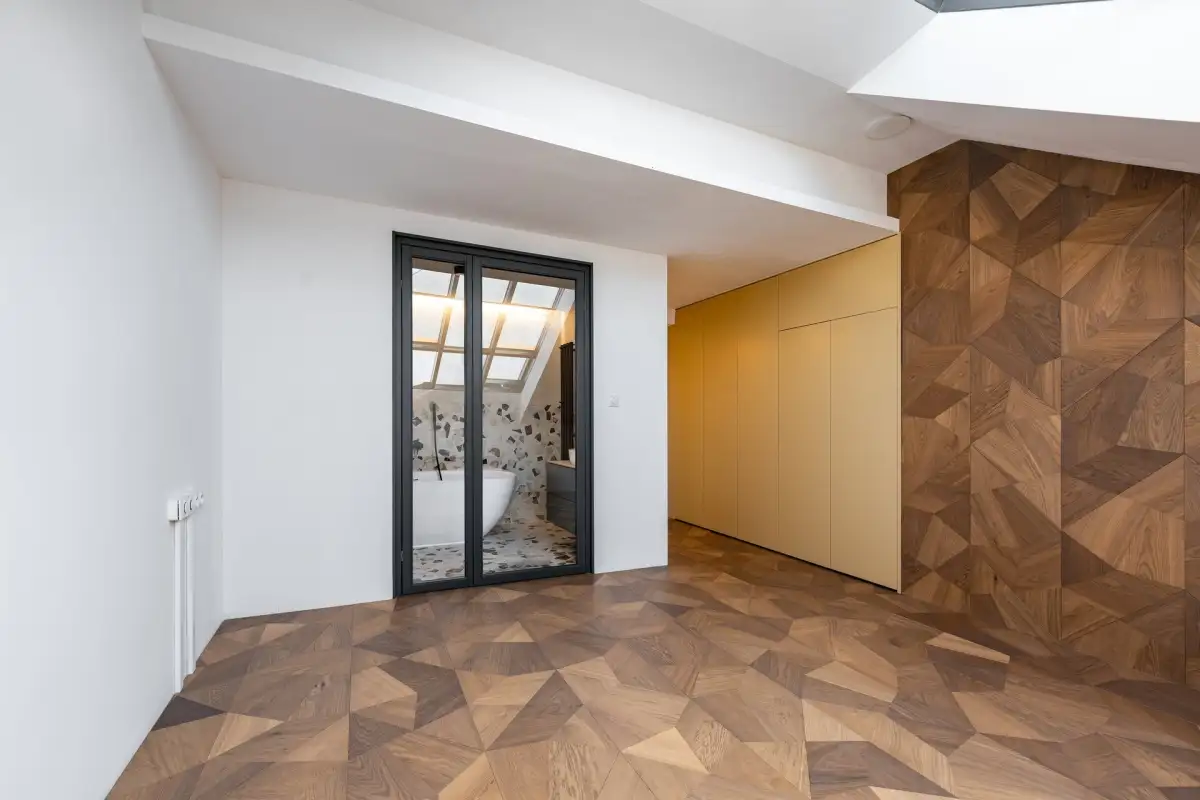 Loft vybízí k vytvoření interiéru s prvky art deco stylu a s ateliérovými okny. Při výstavbě byly použity špičkové materiály: dubová skládaná podlaha (20 mm) od firmy Valen & Masar, umělecké dílo italských mistrů — Foglie d'Oro Fragmenty, dub kouřovaný, mořený, lakovaný.