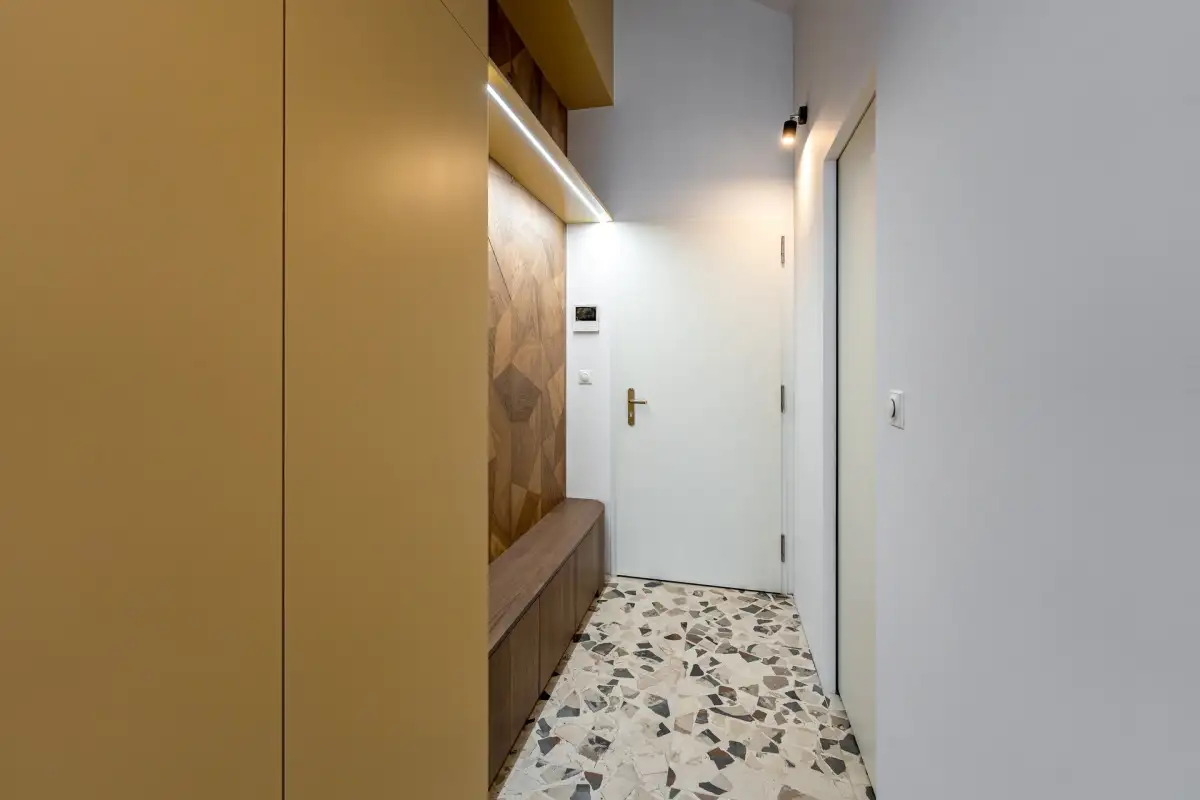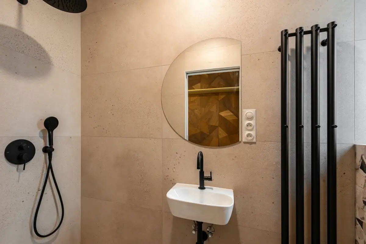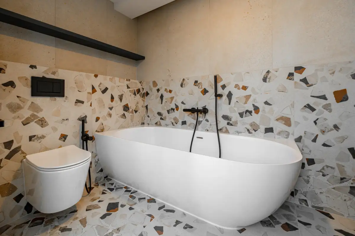 V koupelně a na chodbě je položena originální velkoformátová designová dlažba inspirovaná původním terazzem Cocci Calce Spaccato 900 × 900.