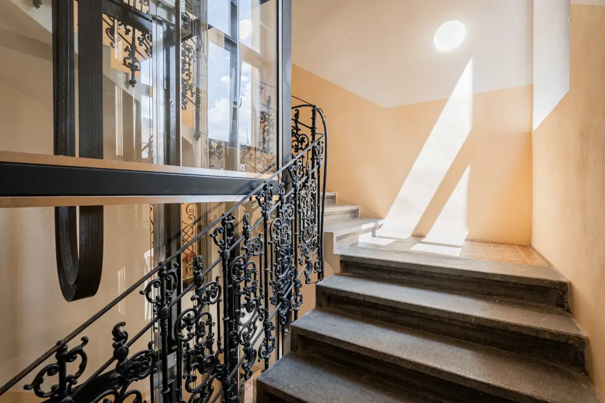 Obývací pokoj je otevřený až do hřebene střechy (4,6 m), má atypický tvar a je ozvláštněn masivním původním komínem, který podtrhuje originalitu celého bytu. Je zde příprava pro kuchyň s ostrůvkem, kombinovaná podlaha (dlažba, dřevo), prostor pro jídelnu a obývací část. V ložnici je pak vestavěná skříň a en-suite koupelna s prosklením, vanou, toaletou a individuálně vyrobeným kruhovým umyvadlem se skříňkou. Druhá koupelna u vchodu do bytu je vybavena sprchou, toaletou a má okno do světlíku. Z chodby vedou schody do horní úrovně bytu na prosvětlenou galerii s průhledem do obývacího pokoje. Pod schody je skříň pro uložení věcí a zázemí pro pračku. K bytu náleží sklep (8 m2).
