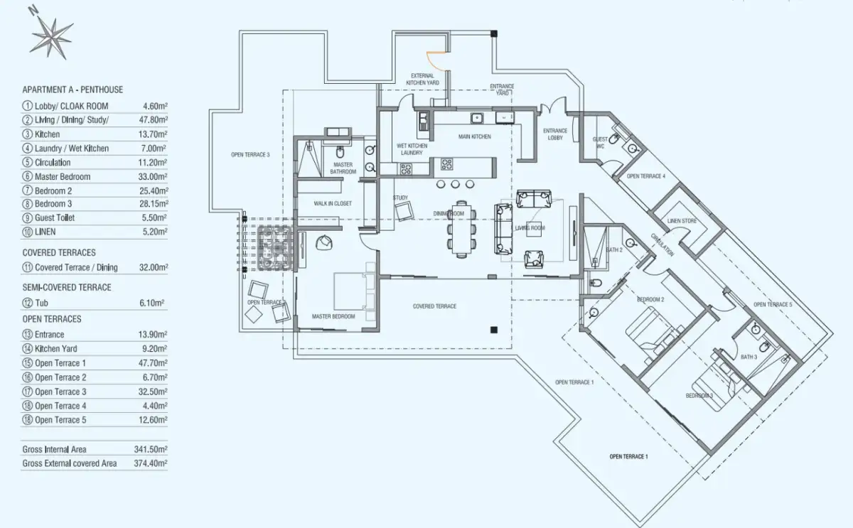 Dispozice bytu o obytné ploše 182 m² zahrnuje tři ložnice s vlastními koupelnami (33 m², 25 m², 28 m²) a terasami. Prostorný obývací pokoj (48 m²) s kuchyní (14 m²) má velké arkýřové okna, skrze které se dostanete na prostorné terasy, které jsou z části zastřešené. Součástí bytu je také prádelna (7 m²), toaleta pro hosty (6 m²), kuchyňský dvorek (9 m²), chodba (5 m²) a spíž (5 m²). K tomuto apartmánu také patří dvě parkovací stání.