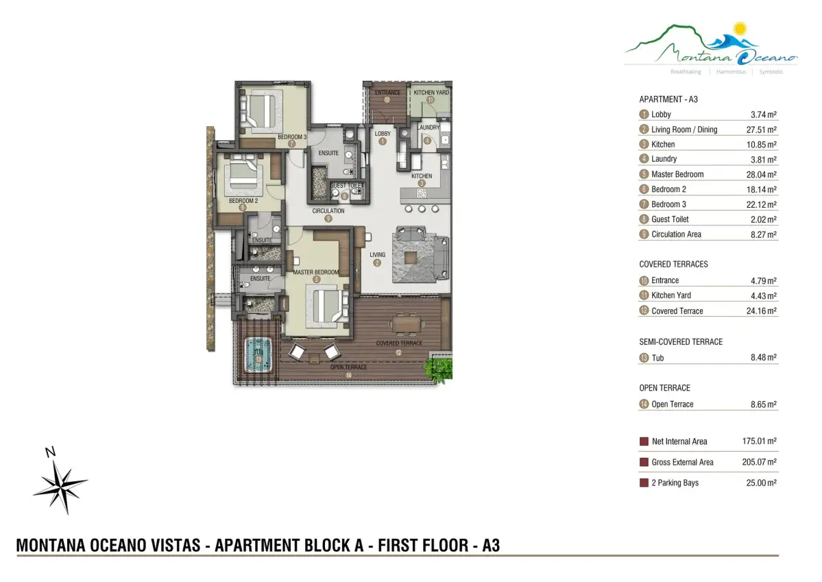 Developerský projekt se skládá z 13 apartmánů a 4 soukromých vil a stojí na dvou pozemcích blízko u sebe: Montana Oceano Apartments o třech blocích čítá celkem 3 luxusní penthousy a 10 moderních apartmánů, všechny mají rozsáhlé terasy s panoramatickými výhledy do okolí, promyšlenou ventilaci a dostatek slunce. Nespornou předností projektu je promyšlený venkovní prostor – součástí strážené soukromé rezidence je bazén, zahrada, fitness a dětské hřiště. Všechny objekty mají zajištěné parkování pro dvě vozidla.