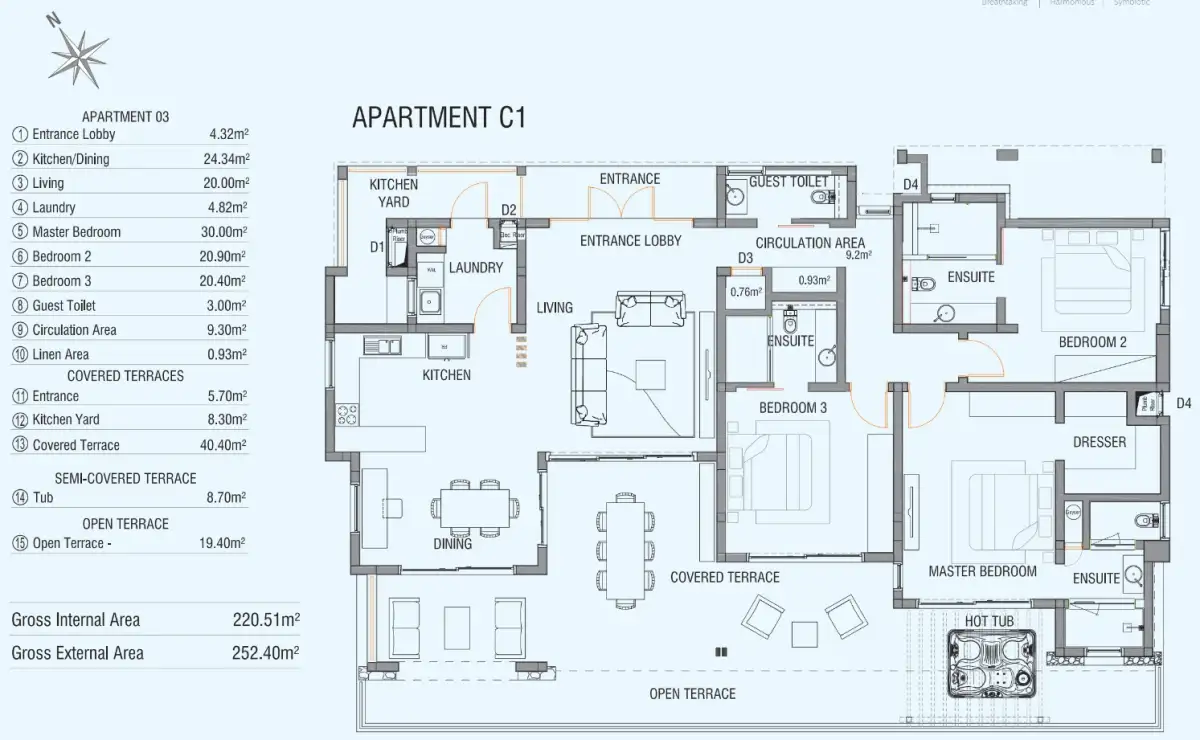 Dispozice bytu o obytné ploše 138 m² zahrnuje tři ložnice s vlastními koupelnami (30 m², 21 m², 20 m²), obývací pokoj (20 m²) s kuchyní (24 m²) s velkými arkýřovými okny, skrze které se dostanete na prostornou terasu (69 m²), která je z části zastřešená. Součástí bytu je také prádelna (5 m²), toaleta pro hosty (3 m²), kuchyňský dvorek (8 m²), chodba (9 m²) a vstupní hala (4 m²). K tomuto apartmánu také patří dvě parkovací stání.