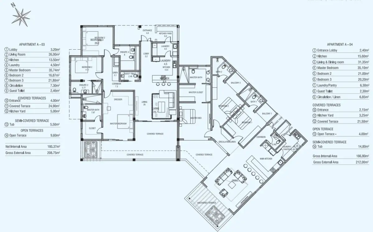 Dispozice apartmánu o rozloze 141 m² zahrnuje tři ložnice s vlastním sociálním zařízením (35 m², 21 m², 20 m²), obývací pokoj (31 m²) s kuchyní (16 m²) s velkými arkýřovými okny, kterými se dostanete na prostornou terasu (40 m²), která je částečně zastřešená. K bytu dále patří prádelna (6 m²), toaleta pro hosty (2 m²), kuchyňský dvorek (3 m²), předsíň (11 m²) a vstupní chodba (4 m²). K tomuto bytu patří také dvě parkovací místa.