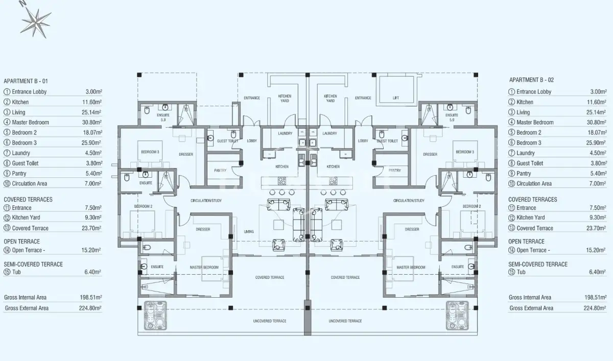 Dispozice bytu o obytné ploše 135 m2 zahrnuje tři ložnice s vlastními koupelnami (31 m2, 26 m2, 18 m2), obývací pokoj (25 m2) s kuchyní (12 m2) s velkými arkýřovými okny, skrze které se dostanete na prostornou terasu (45 m2), která je z části zastřešená. Součástí bytu je také prádelna (5 m2), toaleta pro hosty (4 m2), kuchyňský dvorek (9 m2), spíž (5 m2), chodba (7 m2) a vstupní hala (3 m2). K tomuto apartmánu také patří dvě parkovací stání.