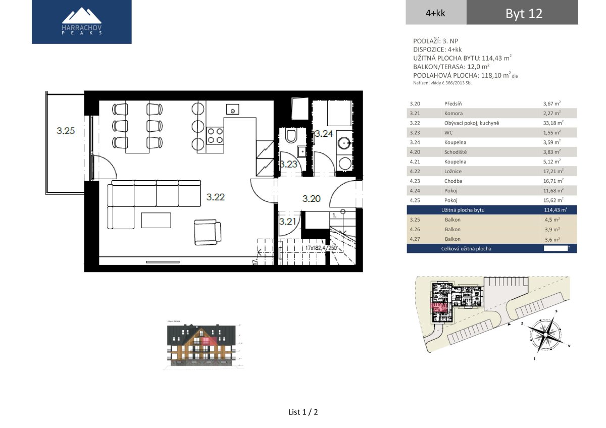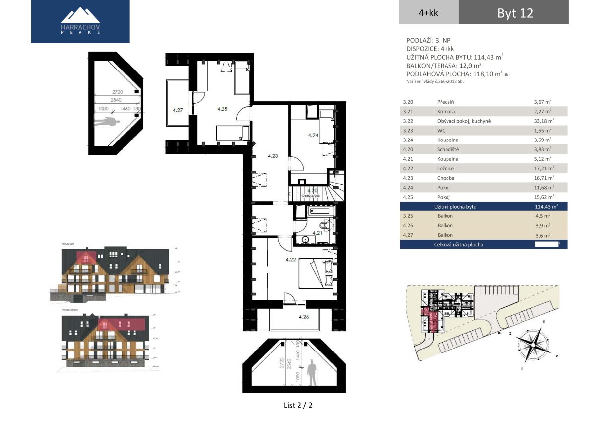 Nabízíme k prodeji mezonetový apartmán o dispozici 4+kk, obytné ploše 114,4 m2 a podlahové ploše 118,1 m2 se třemi balkony 4,6, 3,8 a 3,5 m2, který se nachází ve 3. a 4. nadzemním podlaží nově vznikajícího projektu HARRACHOV PEAKS. Plocha apartmánu se světlou výškou nad 1,2 m je 111,4 m2.