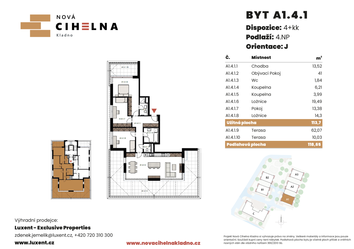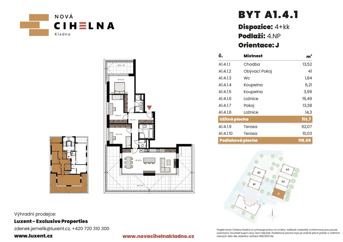 Nabízíme k prodeji byt 4+kk o podlahové ploše 118,65 m² se dvěma terasami 62,07 m² a 10,03 m² v mimořádně úsporném developerském projektu Nová Cihelna Kladno vznikajícím v městské čtvrti Kladno – Rozdělov.