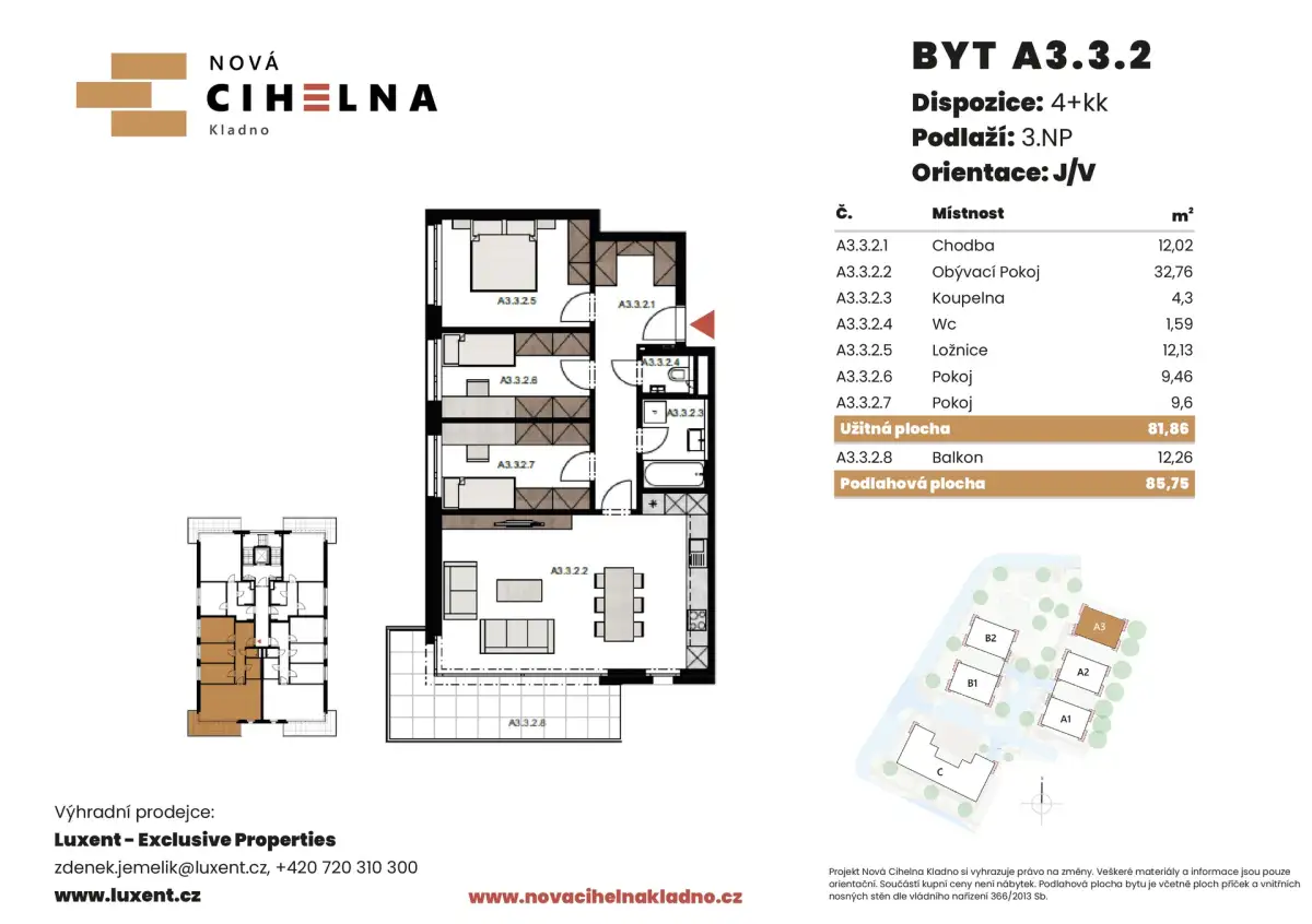 Nabízíme k prodeji byt 4+kk o podlahové ploše 85,75 m² s balkonem 12,26 m² v mimořádně úsporném developerském projektu Nová Cihelna Kladno vznikajícím v městské čtvrti Kladno – Rozdělov.