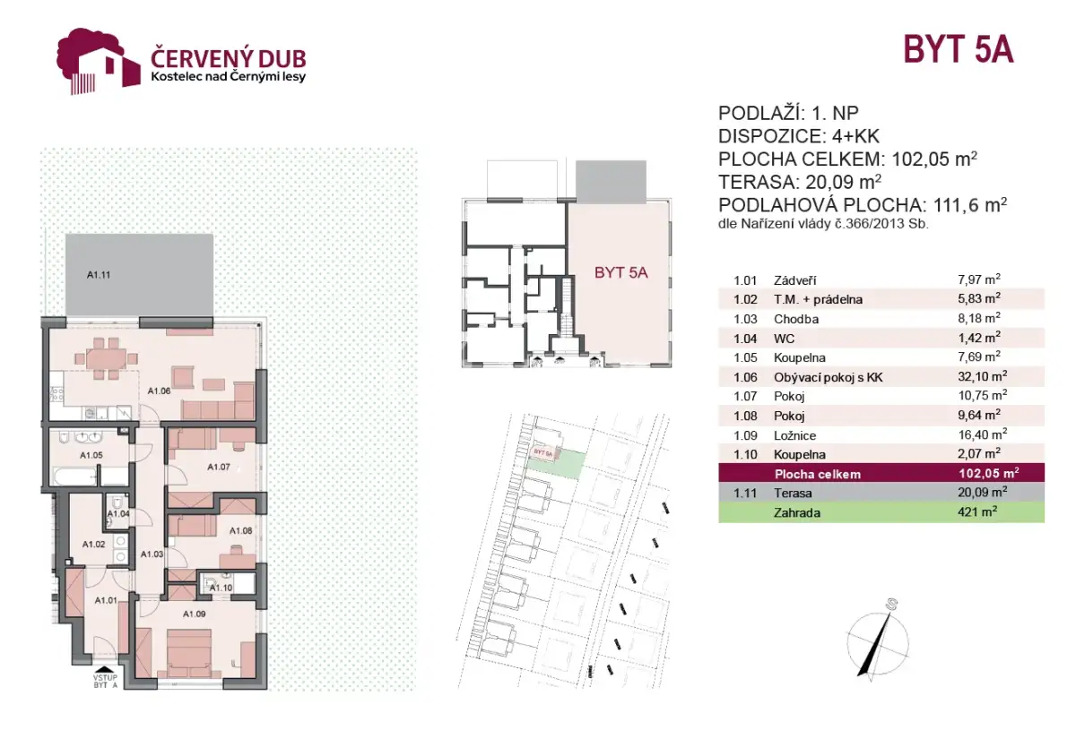 Nabízený byt se nachází v přízemí domu č. 5, který je součástí výstavby 3. etapy projektu Červený dub, v Kostelci nad Černými lesy. V rámci této etapy vznikne 5 komorních domů, každý pouze o čtyřech jednotkách. Projekt je proto vynikajícím řešením pro ty, kdo upřednostňují klidnější a zdravější životní styl blízko přírodě s dobrým dojezdem do větších měst. V okolí projektu je krásná zvlněná lesnatá krajina, přičemž do Prahy nebo Říčan případně Českého Brodu dojedete v řádu desítek minut autem či autobusem, anebo kombinovaně i vlakem. Velkou předností domů projektu je soběstačnost ve výrobě elektrické energie. Všechny domy mají systém střešních fotovoltaických panelů. Energetická náročnost budovy je B – velmi úsporná.