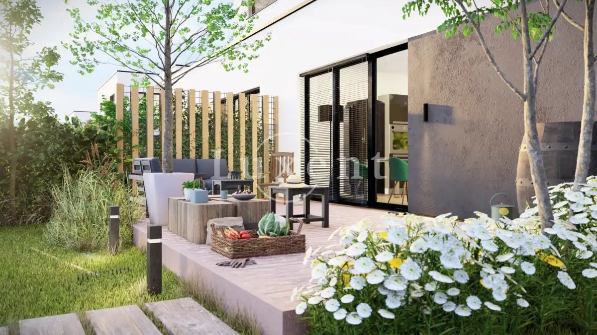 Byt 1A má dispozici 4+kk se zahradou a je situován v přízemí domu č. 1. Jeho orientace je na J, V. Celková užitná plocha bytu čítá 102,5 m2 a mírně svažité zahrada má rozlohu 421 m2. Byt sestává ze vstupní haly s úložným prostorem a vstupem jednak do technické místnosti s prádelnou a jednak do navazující samostatné chodby propojující všechny čtyři pokoje bytu. Dále je zde obývací pokoj, příjemně prosvětlený masivním prosklením s výstupem na terasu a do zahrady. Je zde příprava pro kuchyň. Orientace bytu je na V, S a Z. Zahrada obklopuje byt ze dvou stran a vychází se ni všech pokojů bytu.