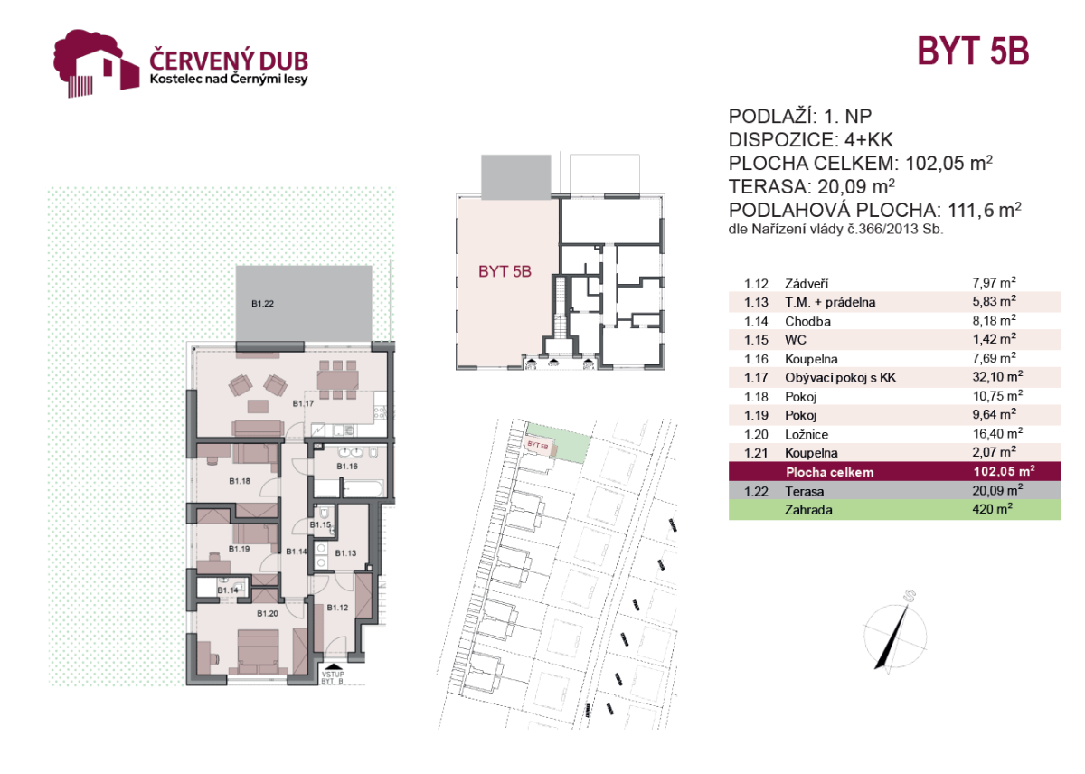 Nabízený byt se nachází v přízemí domu č. 5, který je součástí výstavby 3. etapy projektu Červený dub, v Kostelci nad Černými lesy. V rámci této etapy vznikne 5 komorních domů, každý pouze o čtyřech jednotkách. Projekt je proto vynikajícím řešením pro ty, kdo upřednostňují klidnější a zdravější životní styl blízko přírodě s dobrým dojezdem do větších měst. V okolí projektu je krásná zvlněná lesnatá krajina, přičemž do Prahy nebo Říčan případně Českého Brodu dojedete v řádu desítek minut autem či autobusem, anebo kombinovaně i vlakem. Velkou předností domů projektu je soběstačnost ve výrobě elektrické energie. Všechny domy mají systém střešních fotovoltaických panelů. Energetická náročnost budovy je B – velmi úsporná.