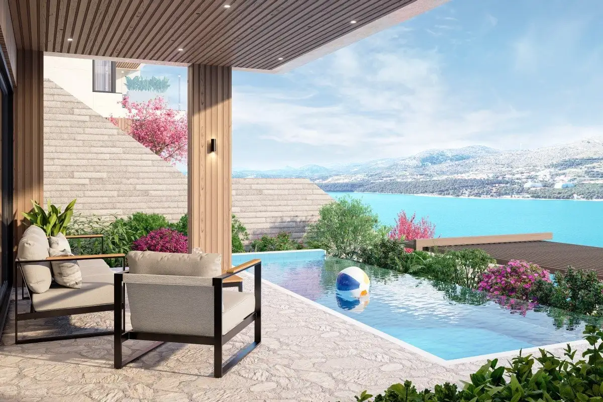 Venkovní prostor je navržen kaskádovitě – terasy se zahradami, soukromý bazén a relaxační zóny zajišťují maximální soukromí a pocit vlastního domu, přestože se byt nachází v menší obytné budově se čtyřmi jednotkami. K dispozici jsou i společné prostory, včetně střešní terasy s lehátky a výhledem na moře, fitness centra, sauny v suterénu a dalšího bazénu. Součástí je jedno kryté parkovací místo s možností dokoupení garáže.