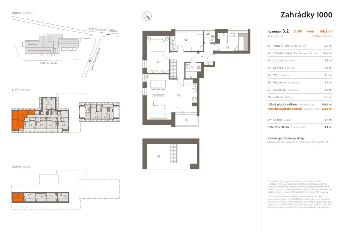 Nabízený apartmán má dispozici 4+kk a celkovou plochu 102,7 m2 s lodžií 3,4 m2. V přízemí nabízí dvě ložnice, obývací pokoj s prostupem na lodžii, koupelnu se sprchou a s přípravou na saunu a chodbu se samostatnou toaletou, a v patře pak galerii jako ložnici. Orientace oken je na všechny světové strany s výhledem do kraje. K apartmánu náleží sklep.