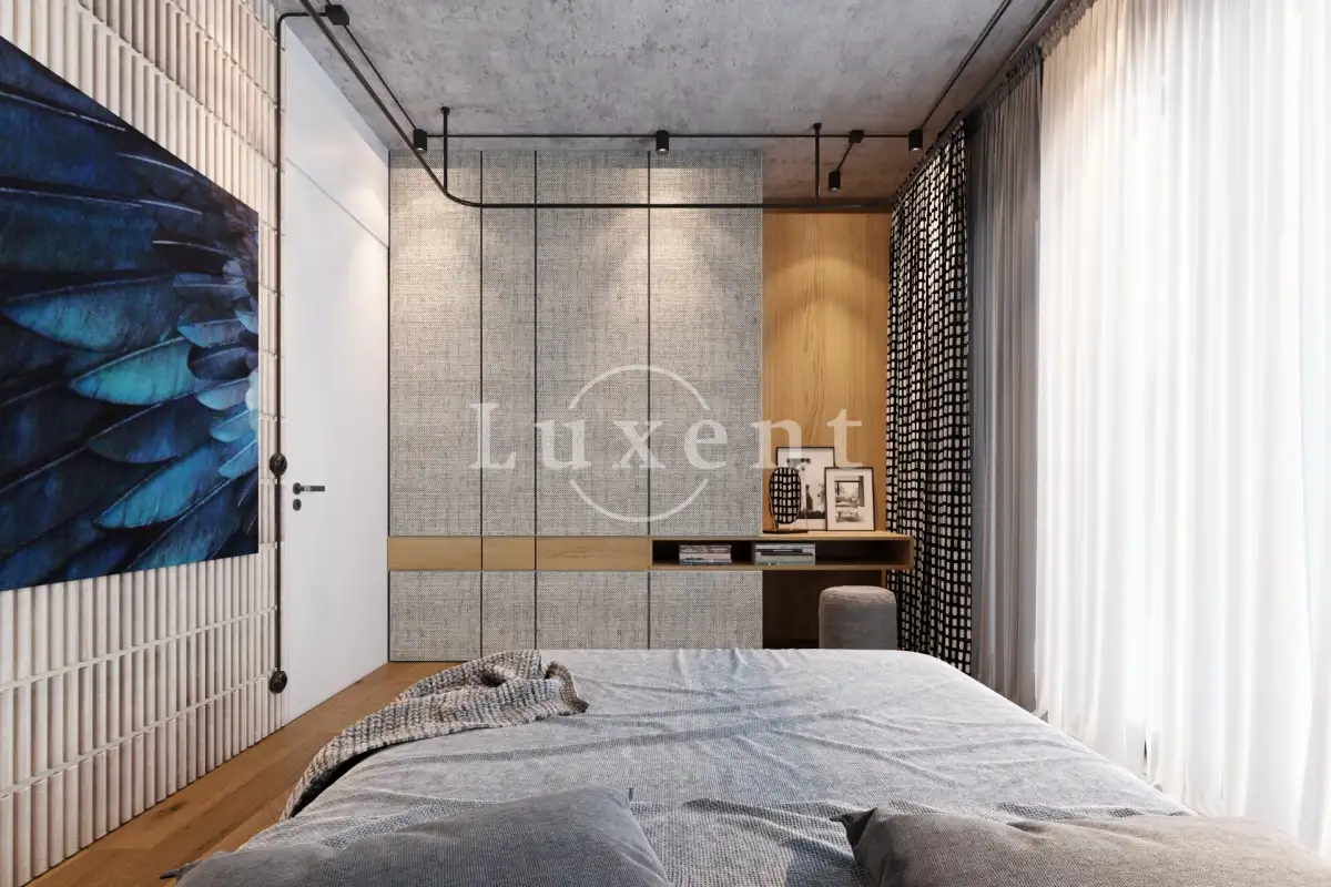 Byt je situován v 5. NP novostavby, interiér zahrnuje vstupní chodbu, prostorný obývací pokoj s kuchyňským koutem a jídelní částí, tři ložnice, dvě koupelny (vana a sprchový kout) a samostatnou toaletu. Ze všech obytných částí je vstup na terasu. K bytů náleží dvě parkovací stání v podzemních garážích a dva zděné sklepy. Součástí bytu je klimatizace. Všechny byty disponují SMART Home systémem pro řízení domácnosti.