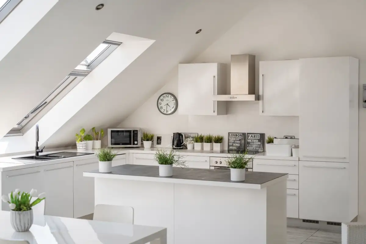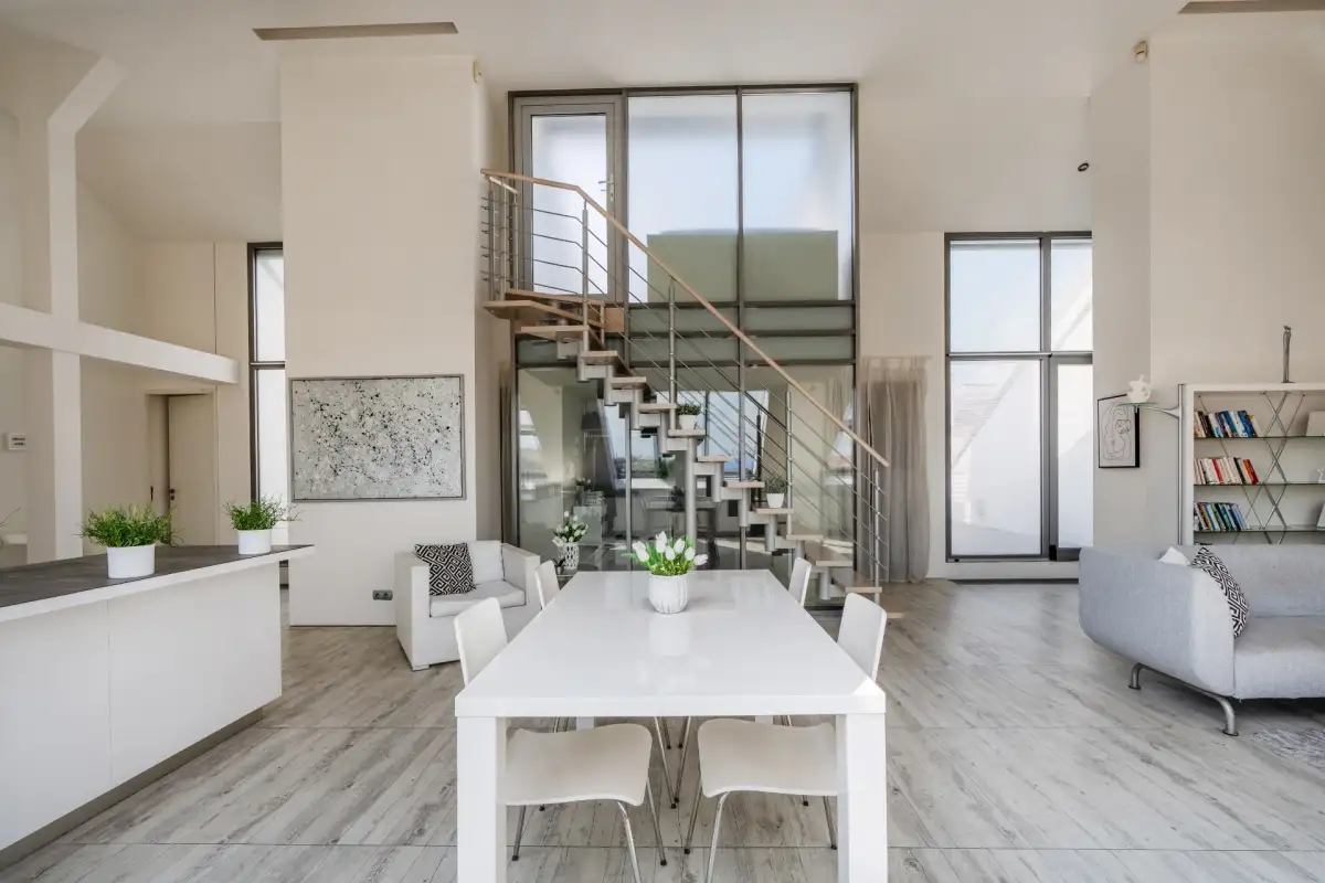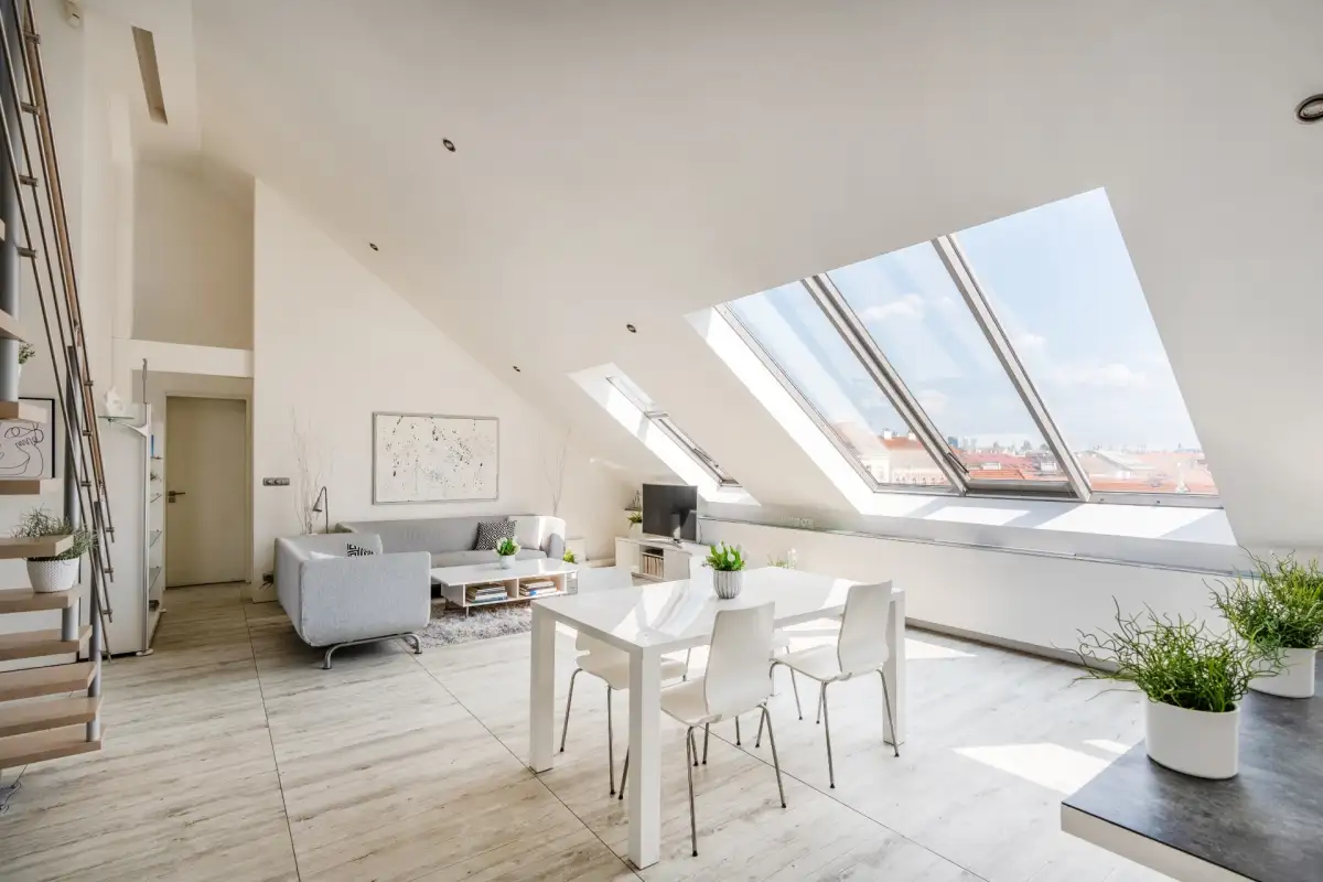 Do bytu se vchází přes vstupní zádveří do prostorného obývacího pokoje s kuchyní a jídelnou (79 m²). Odtud vede moderní schodiště na horní terasu s výhledem na Pražský Hrad a Petřín.