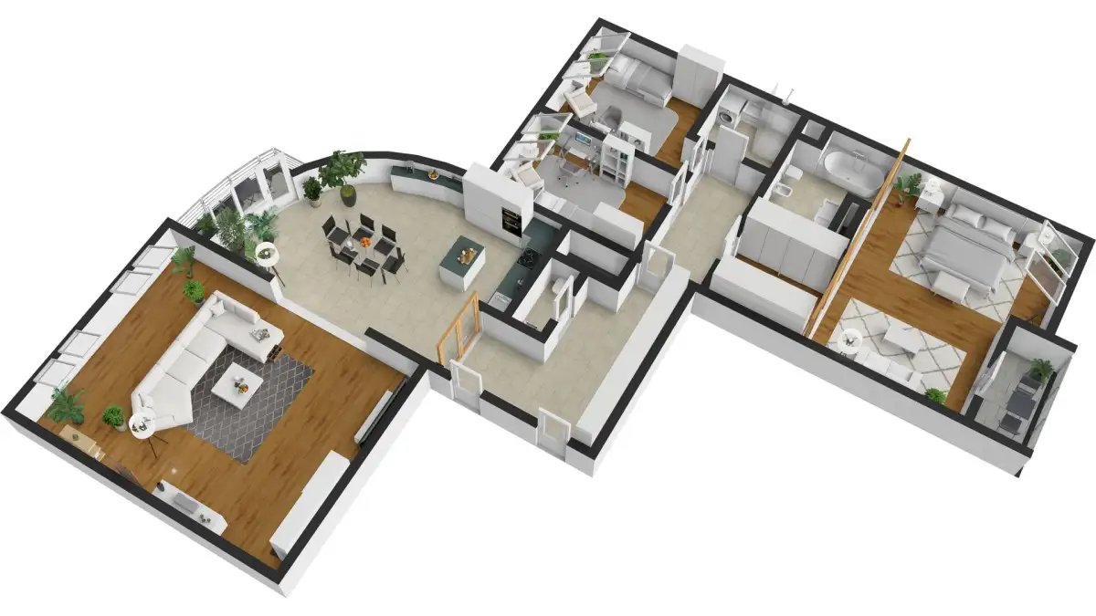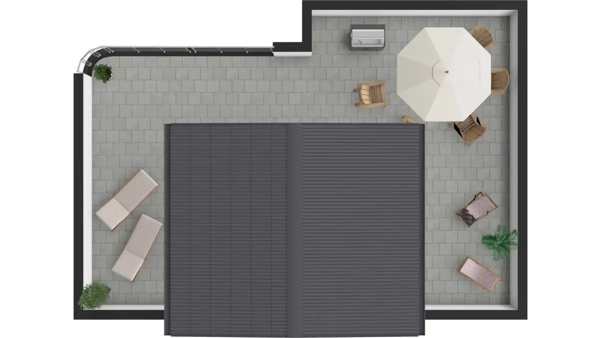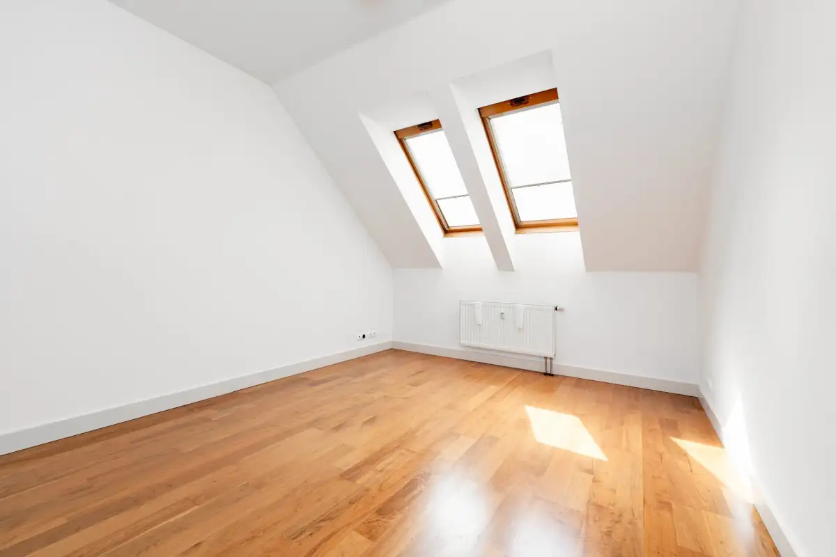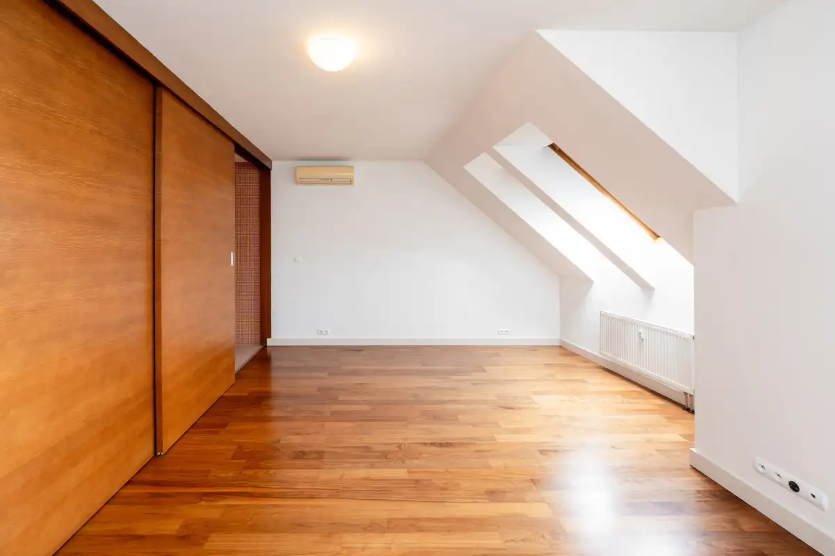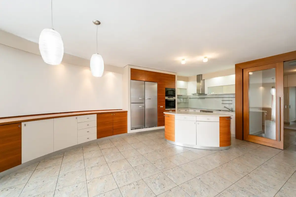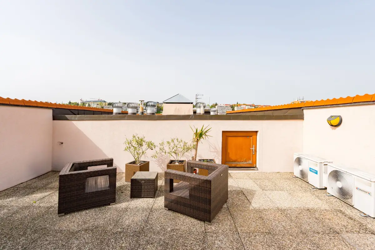 Centrální částí bytu je prostorný obývací pokoj propojený s moderně vybavenou kuchyní, ze které je rovněž přístup na druhý balkon. Pokud vystoupáte po schodišti do druhého podlaží, ocitnete se na střešní terase o rozloze 93 m², která poskytuje výhledy do okolí a stane se Vaším soukromým útočištěm pro relaxaci i společenské akce.