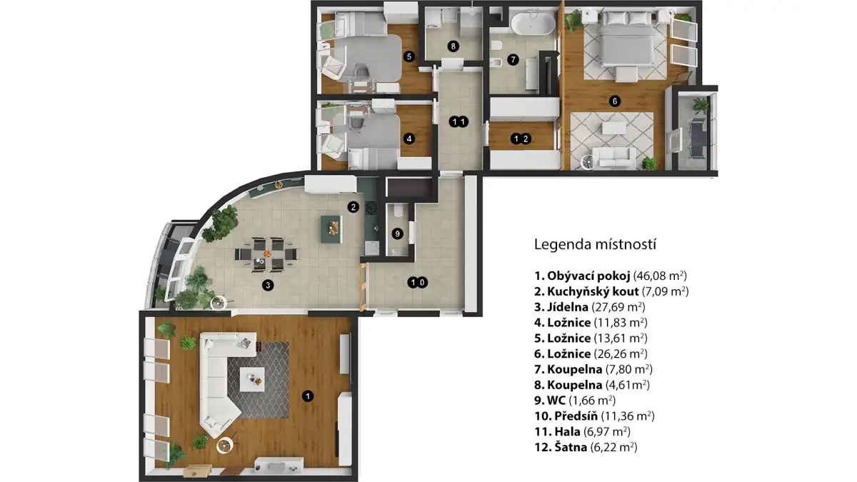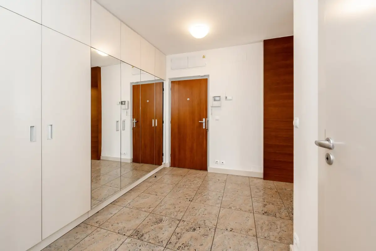 Byt je situován v šestém a sedmém podlaží rezidenčního domu a jeho dispozice je navržena pro maximální pohodlí a funkcionalitu. V prvním podlaží se nachází vstupní hala s vestavěnými skříněmi, master ložnice s přístupem na balkon, která disponuje vlastní koupelnou vybavenou vanou, dvojumyvadlem, toaletou a bidetem. Dále v bytě naleznete další dvě neprůchozí ložnice, koupelnu se sprchovým koutem a samostatnou toaletu.