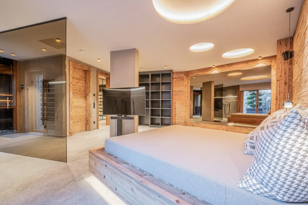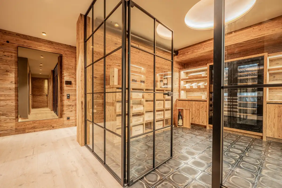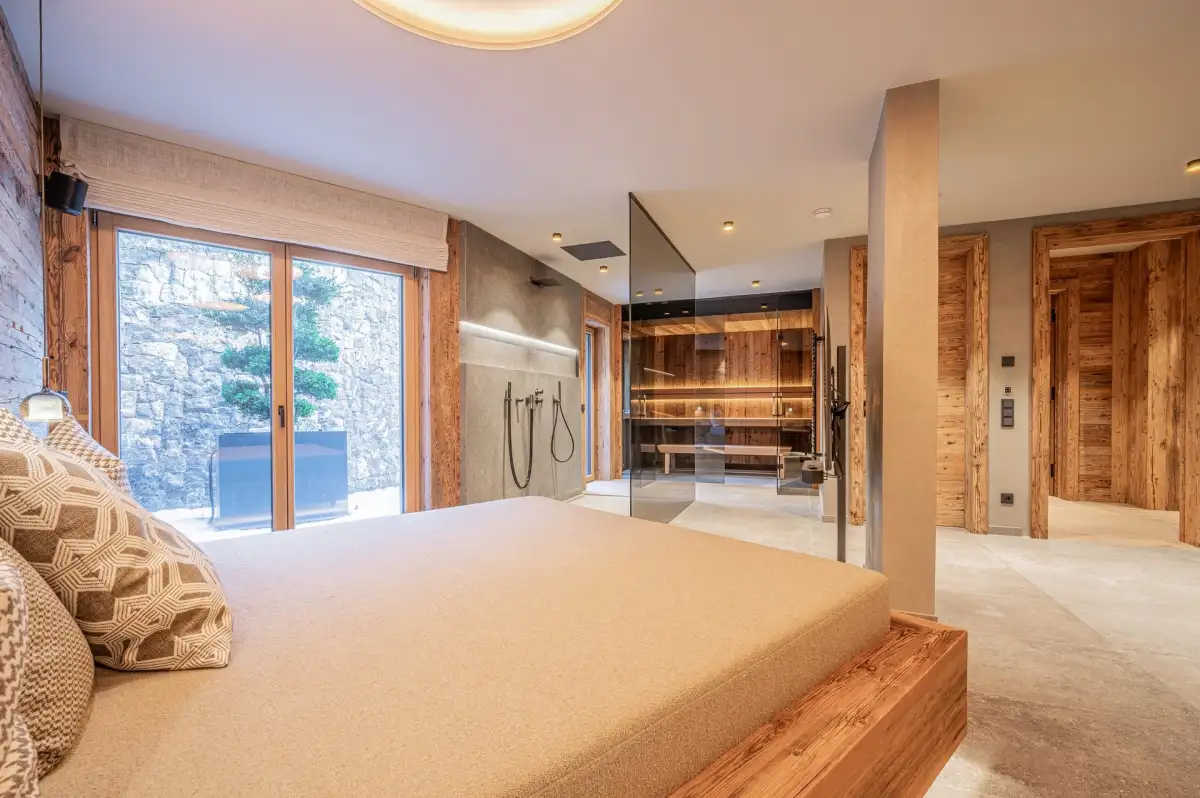 Horní patro nabízí prostorný obývací, jídelní a kuchyňský kout s vysokým stropem a velkými okny, které umožňují nádherný výhled na okolní hory. Kvalitní kuchyně je vybavena spotřebiči Miele, Bora a Qooker, což zaručuje prvotřídní zážitek z vaření. V přízemí se nachází luxusní hlavní ložnice s vlastní koupelnou a šatními skříněmi. Další dvě ložnice v suterénu jsou zařízeny exkluzivním nábytkem a mají vlastní koupelny.