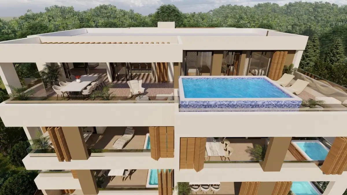 Penthouse má čistou obytnou plochu 255 m², z níž 89 m² tvoří velkorysý otevřený prostor s obývacím pokojem, jídelnou a kuchyní. K dispozici jsou tři prostorné ložnice, dvě koupelny (jedna vybavená saunou) a samostatná toaleta. O dokonalý odpočinek pod širým nebem se stará zastřešená lodžie (35 m²) a terasa o rozloze 74 m² s dechberoucím výhledem na moře a ostrovy, na které se nachází soukromý bazén a prostor pro společenské posezení.