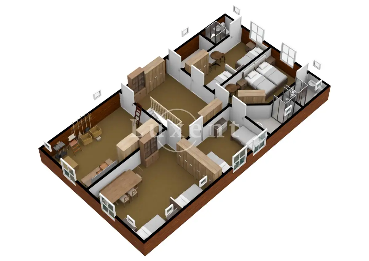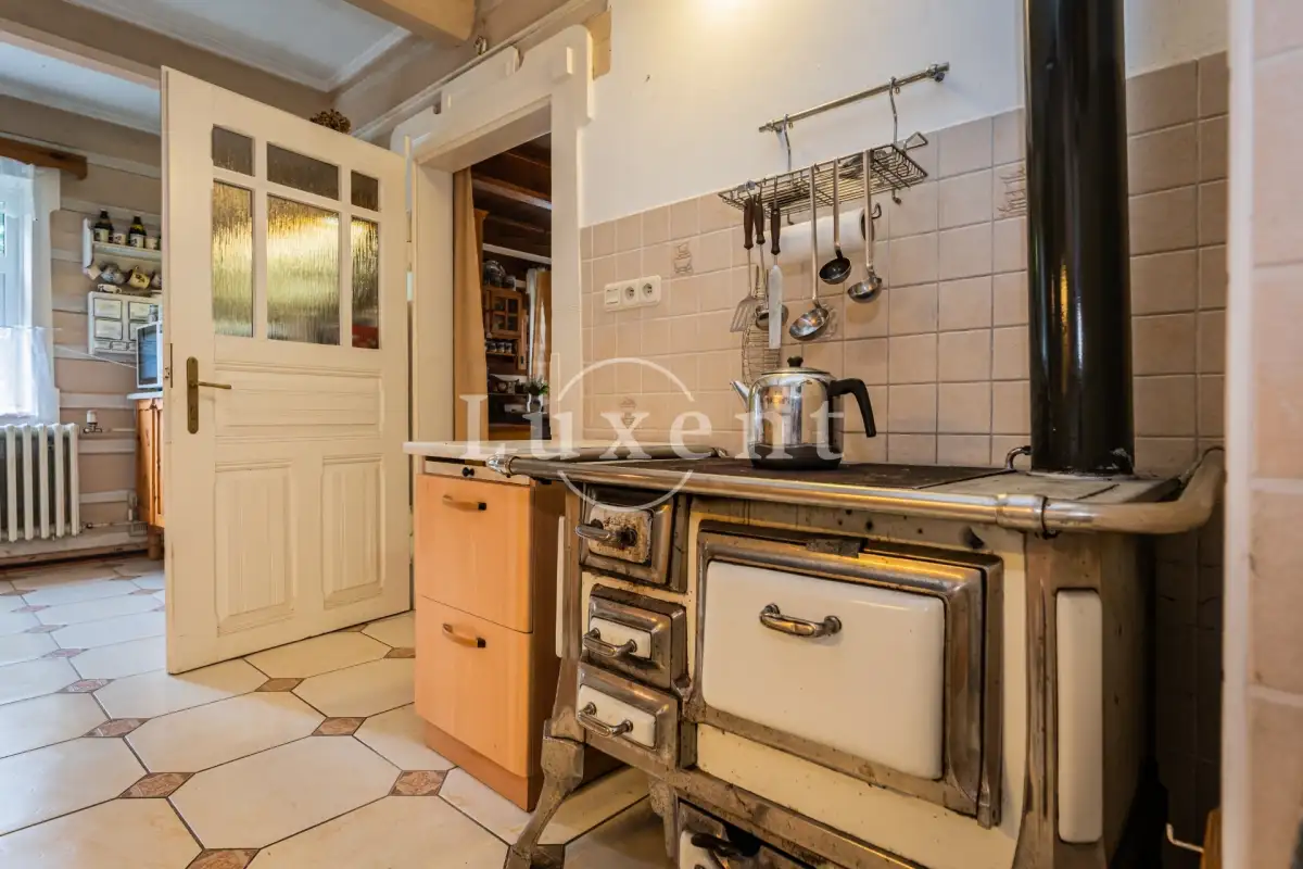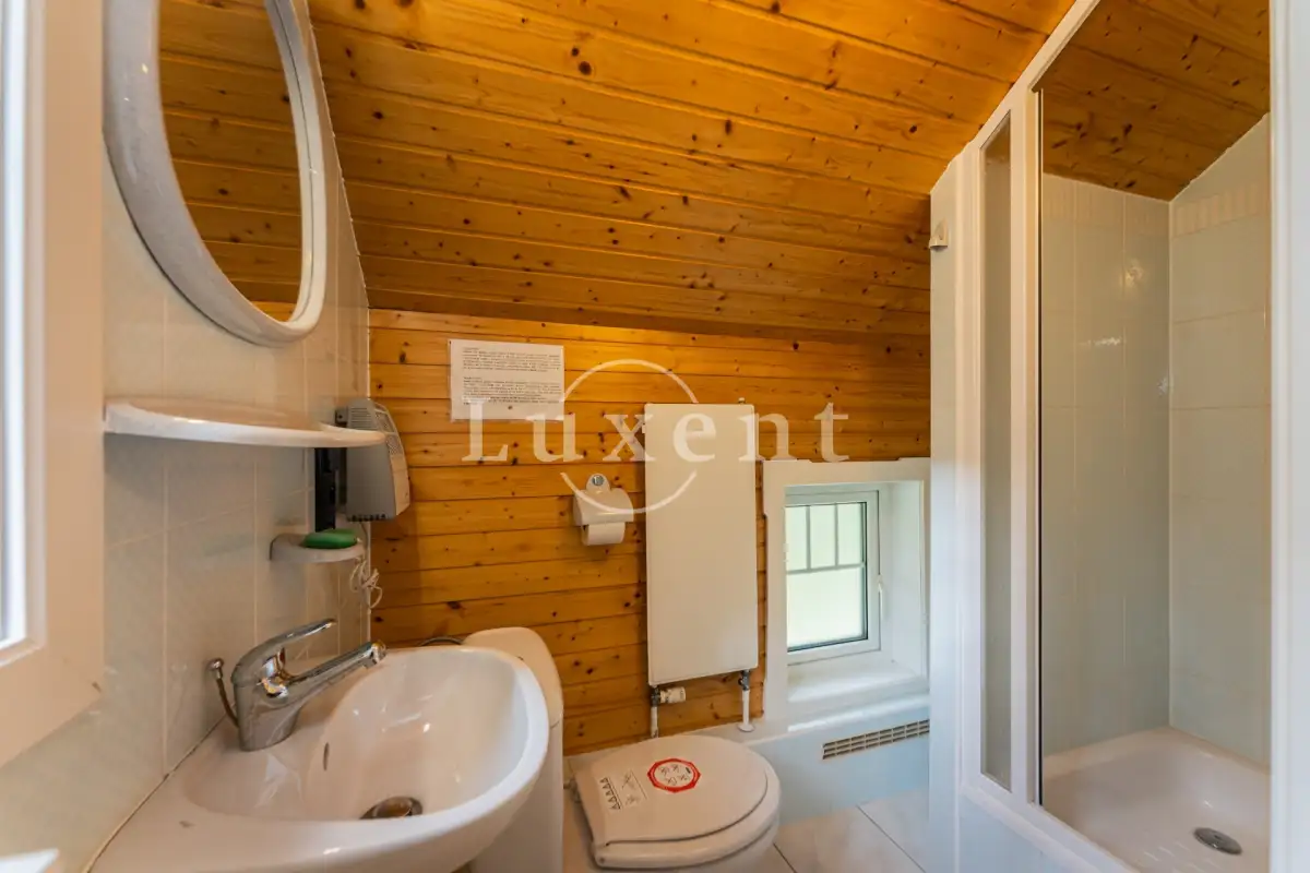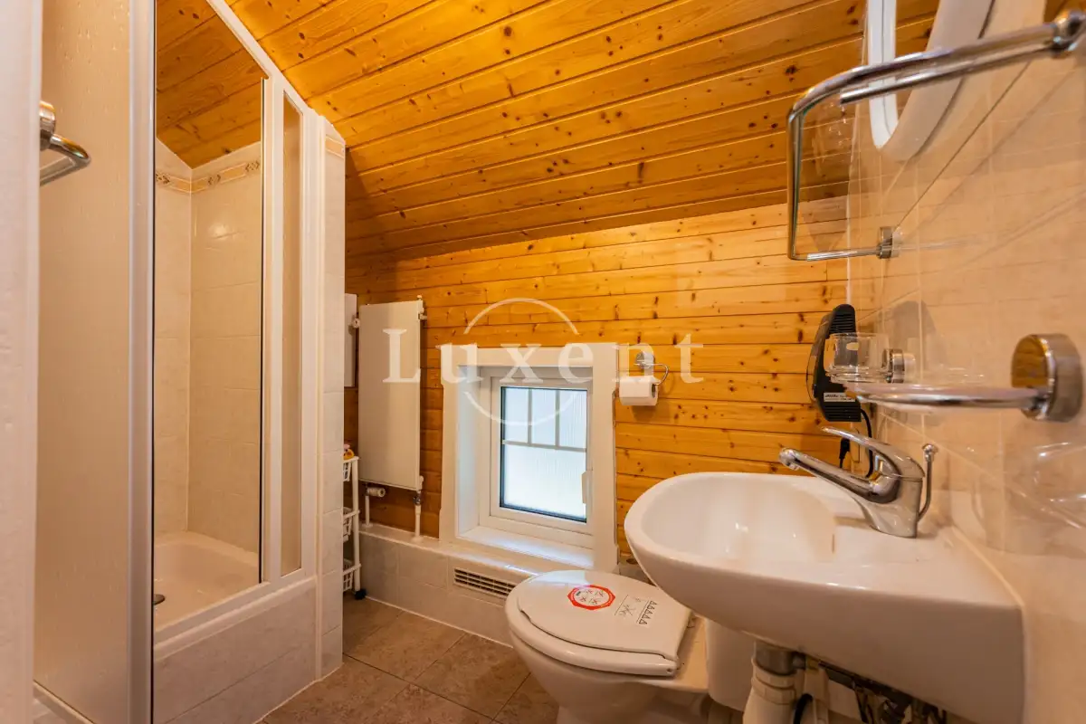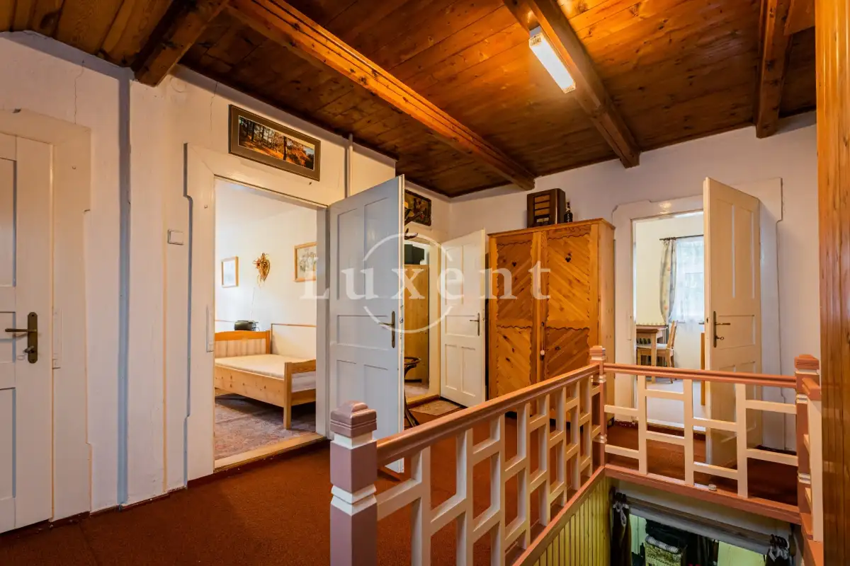 V poschodí jsou čtyři ložnice, tři koupelny s toaletou, komora a prostorná místnost dříve užívaná jako truhlářská dílna.