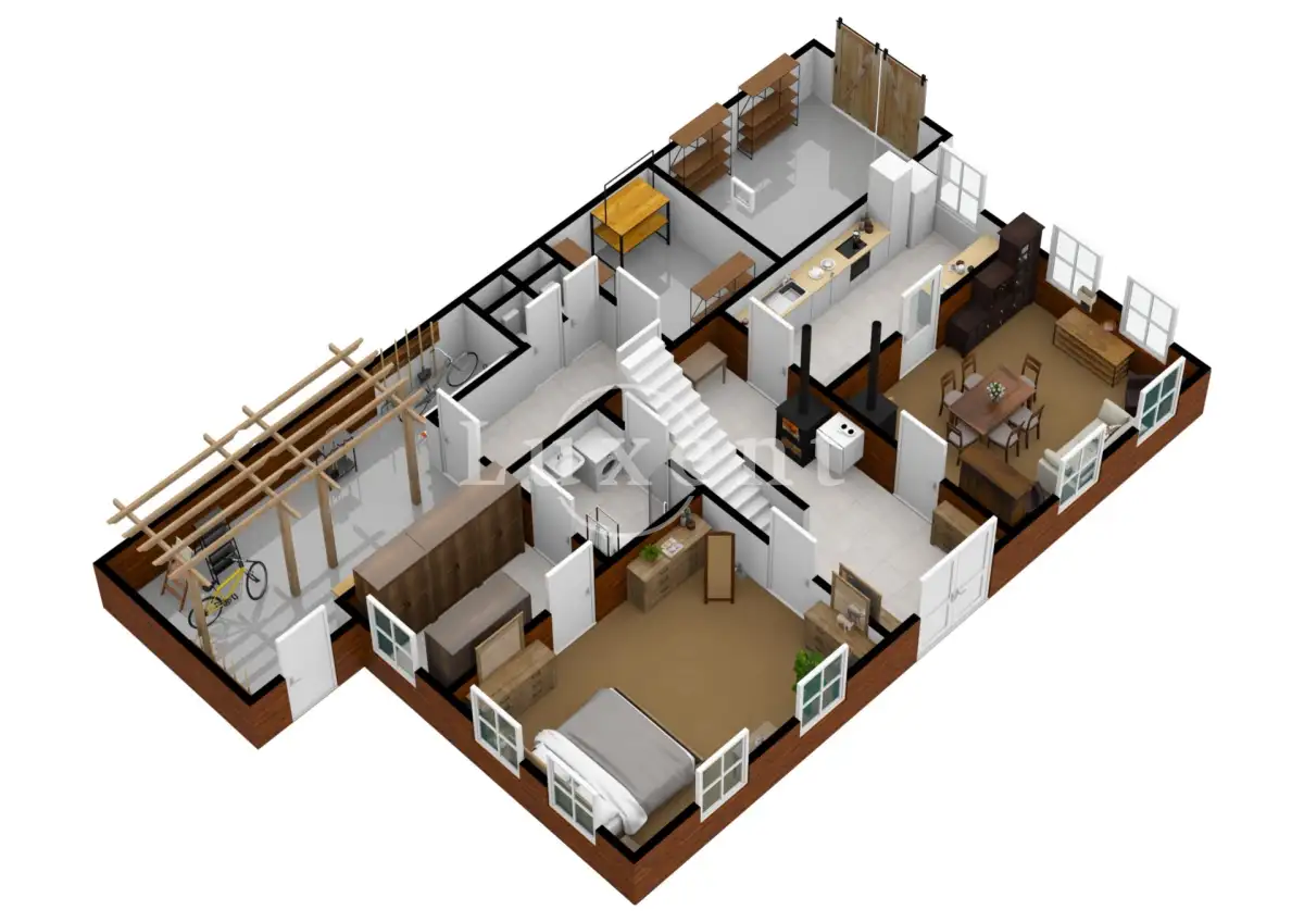 V přízemí se nachází obývací pokoj, kuchyně, ložnice, další pokoj, koupelna se sprchovým koutem, prostorem na pračku a toaletu, centrální chodba, lyžárna, dvě samostatné toalety, sklep, dílna a samostatná garáž.