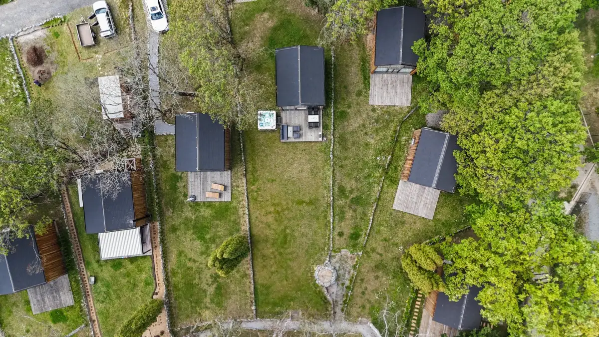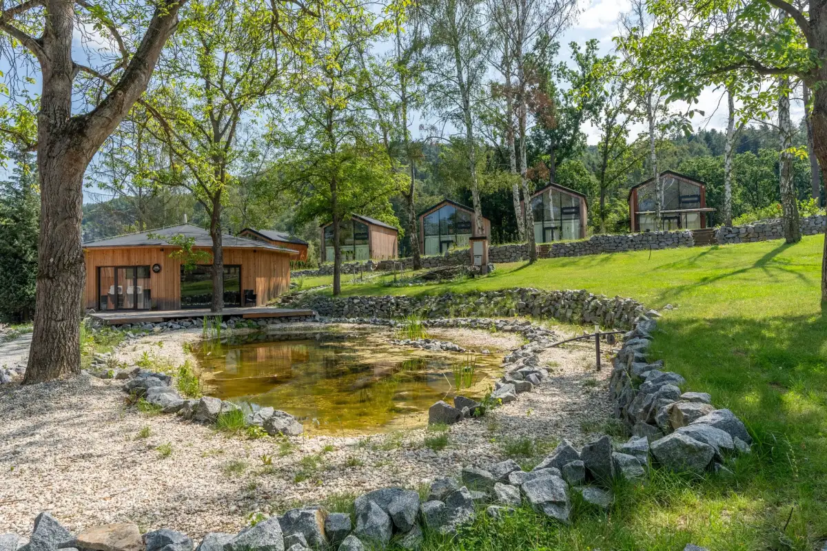 Chata je provedena v moderním, vkusně minimalistickém pojetí, které umožňuje nízkonákladové bydlení s minimálními nároky na údržbu. Materiálové řešení kombinuje dřevěný fasádní obklad, velkoformátová prosklení na čelních fasádách a střešní krytinu z bonnského šindele. Střídmý design čerpá z přírodních materiálů a navazuje na okolní přírodu. Velkoformátová čelní skla umožňují dokonalé prosvětlení vnitřních prostor a otevřené výhledy do okolí, což rezidentům přináší uklidňující pocit, že i doma jsou přirozenou součástí přírody.