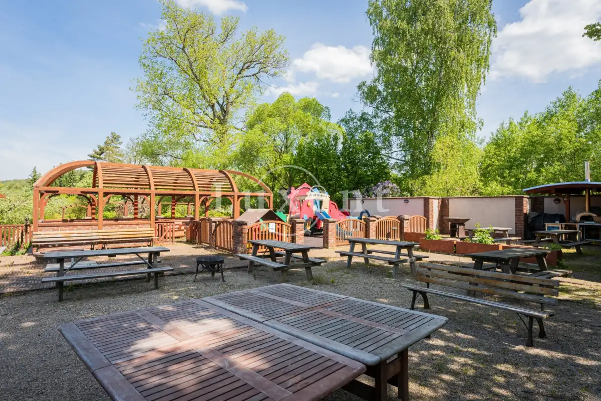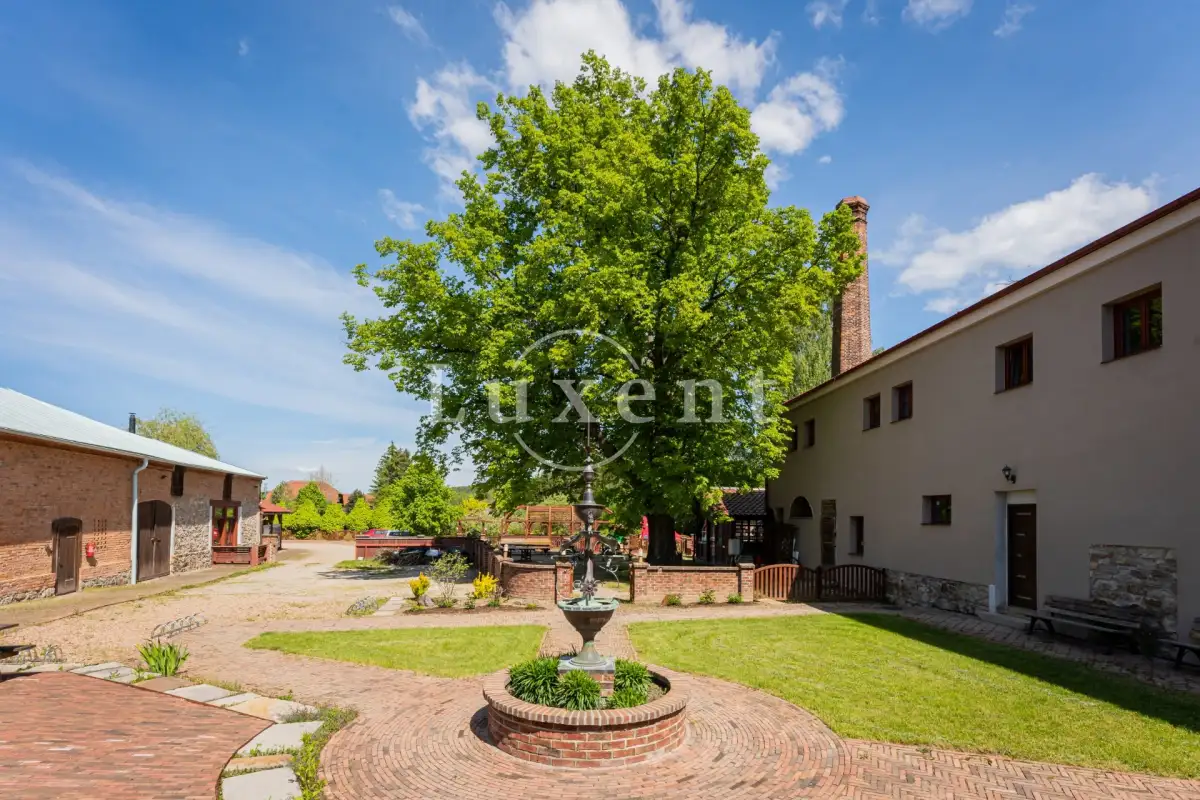 Nedílnou součástí objektu je stylové nádvoří, společenská stodola pro posezení i tanec při událostech, relaxační park plný prožitků s jezírkem (venkovní posilovna, cvičení na trávníku, stezka obratnosti, pikniky v trávě), cvičný green, prostory pro živou a reprodukovanou hudbu, parkoviště pro 15 automobilů, dětské hřiště, venkovní bistro, pec a gril, zázemí pro sezonní provoz – úschovna kol a zavazadel, toalety.