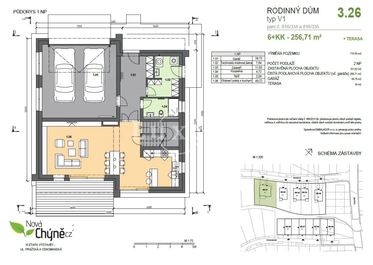Na západním okraji Prahy s dojezdem 14 km do centra Prahy nabízíme v projektu Nová Chýně velkorysý rodinný dům se zahradou, dvougaráží a dvěma parkovacími stáními. Výjimečný dům v tomto projektu zejména svou polohou (je rohový s větším pozemkem), stavebně-technickou kvalitou, skvělými dispozicemi se třemi koupelnami a dostatkem úložných prostor i přípravou na FVE. Dispozice 6+kk je rozložena ve dvou NP na celkové podlahové ploše 256,7 m2 a užitné ploše 249 m2, vč. terasy 19 m2. Celková rozloha pozemku činí 715,6 m2, z čehož zastavěná plocha je 151,5 m2 a zahrada 564 m2. Součástí domu je dvougaráž a další park. stání na vlastním pozemku.