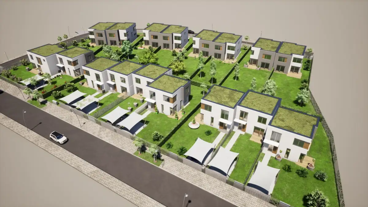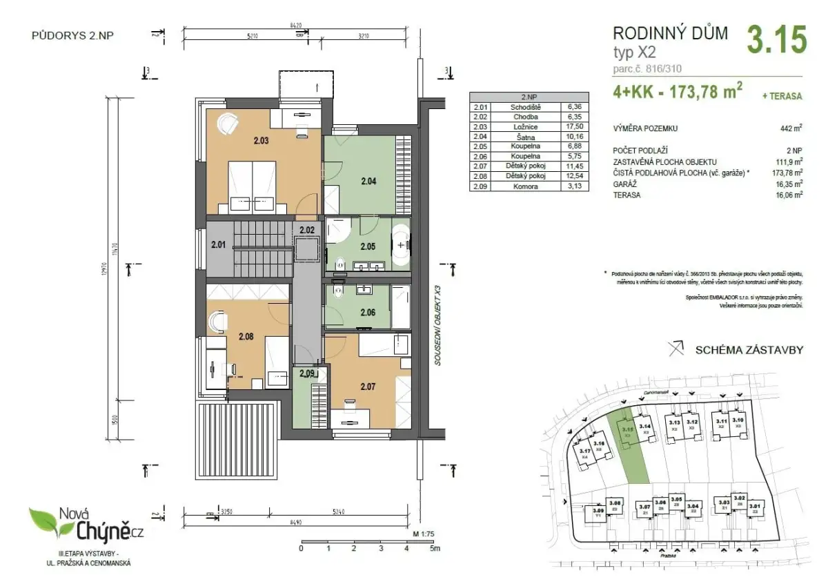 Nabízíme energeticky úsporný rodinný dům se zahradou v projektu NOVÁ CHYNĚ, na západním okraji Prahy – ve městě Chýně – s dojezdem 14 km do centra Prahy. Projekt uspokojí lokalitou, kvalitou zděných domů s praktickými dispozicemi a zahradami i technologickou promyšleností. Nabízený rodinný dům je zděný, má dispozici 4+kk+G, podlahovou plochu 173,8 m2, celkovou užitnou plochu 173,4 m2, z toho terasu 16 m2. Stojí na pozemku o rozloze 442 m2 se zahradou 330 m2. Součástí domu je garáž pro jeden vůz a jedno další park. stání je na vlastním pozemku.