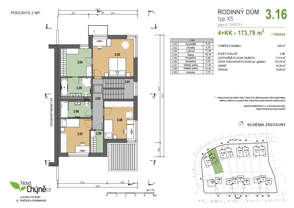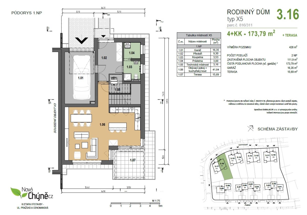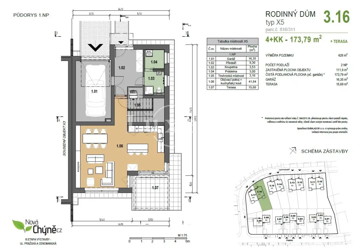 Nabízíme energeticky úsporný rodinný dům se zahradou v projektu NOVÁ CHYNĚ, na západním okraji Prahy – ve městě Chýně – s dojezdem 14 km do centra Prahy. Projekt uspokojí lokalitou, kvalitou zděných domů s praktickými dispozicemi a zahradami i technologickou promyšleností. Nabízený rodinný dům je zděný, má dispozici 4+kk, podlahovou plochu 173,8 m2, celkovou užitnou plochu 173,3 m2, z toho terasu 15,7 m2. Stojí na pozemku o rozloze 428 m2 se zahradou 316 m2. Součástí domu je garáž pro jeden vůz a jedno další park. stání je na vlastním pozemku.