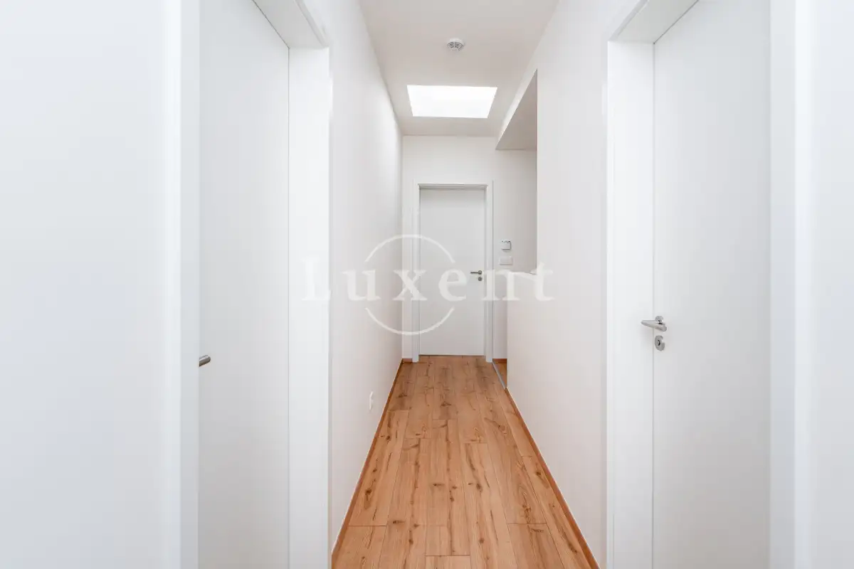 V přízemí domu se nachází předsíň, koupelna, prádelna, tech. místnost a velký obývací pokoj s kuchyňským koutem (42 m2) masivně prosklený do zahrady s terasou. V přízemí domu je také integrovaná garáž. V patře je pak hlavní ložnice s vlastní koupelnou a šatnou, dva pokoje s druhou koupelnou a prostorná úložná komora. Chodba nad schodištěm je prosvětlena světlíkem. Více viz přiložené půdorysy. Na podlahách je kvalitní laminátová plovoucí podlaha (dekor dle domu) a keramická dlažba. Vybavení koupelen: Villeroy & Boch.