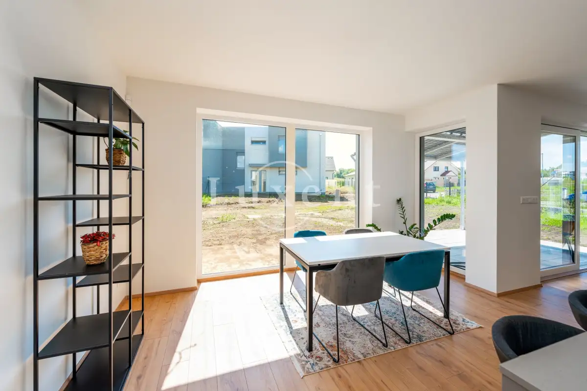 Dům je postaven z cihel Porotherm 18-30 Profi (vč. příček 11,5). Je zateplen 120 mm EPS a vytápěn tepelným čerpadlem vzduch-voda DeDitrich s rozvodem tepla podlahovým topením vč. koupelen. V garáži vytápění radiátorem. Dům má okna s trojitým zasklením a bezprahový HS portál (s přípravami pro žaluzie). Součástí nemovitosti je retenční nádrž pro dešťovou vodu (2 m3) a dále příprava: pro fotovoltaiku, automatické ovládání brány a el. otevírání světlíku v 1. NP. Je zde videotelefon. Střecha: střešní PVC fólie s vrstvou kačírku. V garáži je jedno nabíjecí stání, ukončeno zásuvkou. Na zahradě je terasa z betonových dlaždic a rozhrnutá ornice. Sousedící pozemky jsou odděleny drátovým plotem s PVC úpravou a směrem do ulice jsou 3D plotové dílce s gabionovým základem.