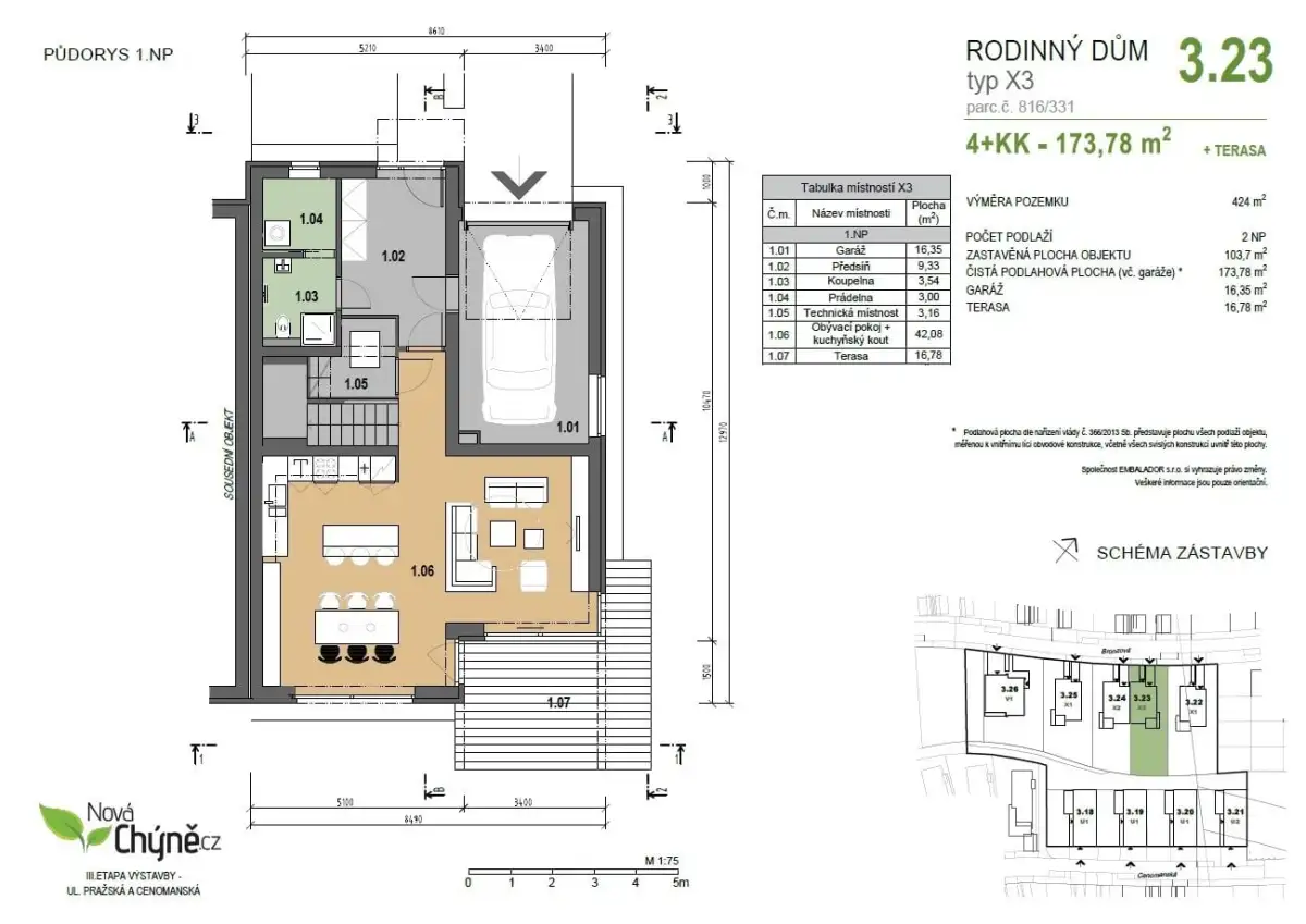 Nabízíme rodinný dům se slunnou zahradou v projektu Nová Chýně, na západním okraji Prahy – ve městě Chýně – s dojezdem 14 km do centra Prahy. Projekt uspokojí lokalitou, kvalitou zděných domů s praktickými dispozicemi a zahradami i technologickou promyšleností. Nabízený rodinný má dispozici 4+kk, podlahovou plochu 173,8 m2, terasu 16,8 m2. Stojí na pozemku o rozloze 424 m2 se zahradou 320 m2. Součástí domu je garáž pro jeden vůz a jedno další park. stání je na vlastním pozemku.