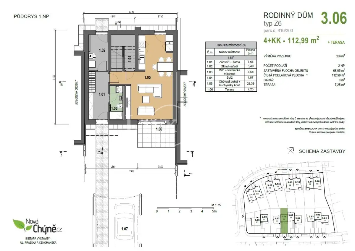 Nabízíme úsporný rodinný dům se zahradou v projektu NOVÁ CHYNĚ, na západním okraji Prahy – ve městě Chýně – s dojezdem 14 km do centra Prahy. Projekt uspokojí kvalitou lokalitou, zděných domů s praktickými dispozicemi a zahradami i technologickou promyšleností. Nabízený rodinný dům má dispozici 4+kk, podlahovou plochu 113 m2, celkovou užitnou plochu 107,5 m2 – z toho terasu 7,25 m2. Stojí na pozemku o rozloze 237 m2 – z toho zahrada 169 m2. Součástí domu je jedno park. stání na vlastním pozemku.